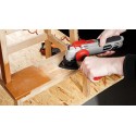 Korpus z trwałego i lekkiego materiału posiada również możliwość podłączenia adaptera do odsysania pyłu i wiórów. Ergonomiczna rękojeść o antypoślizgowych właściwościach wpływa na komfort i wygodę użytkowania tego narzędzia. Dodatkowo zestaw uzupełniają: walizka, druga rękojeść oraz papier ścierny P80 (5 sztuk).
