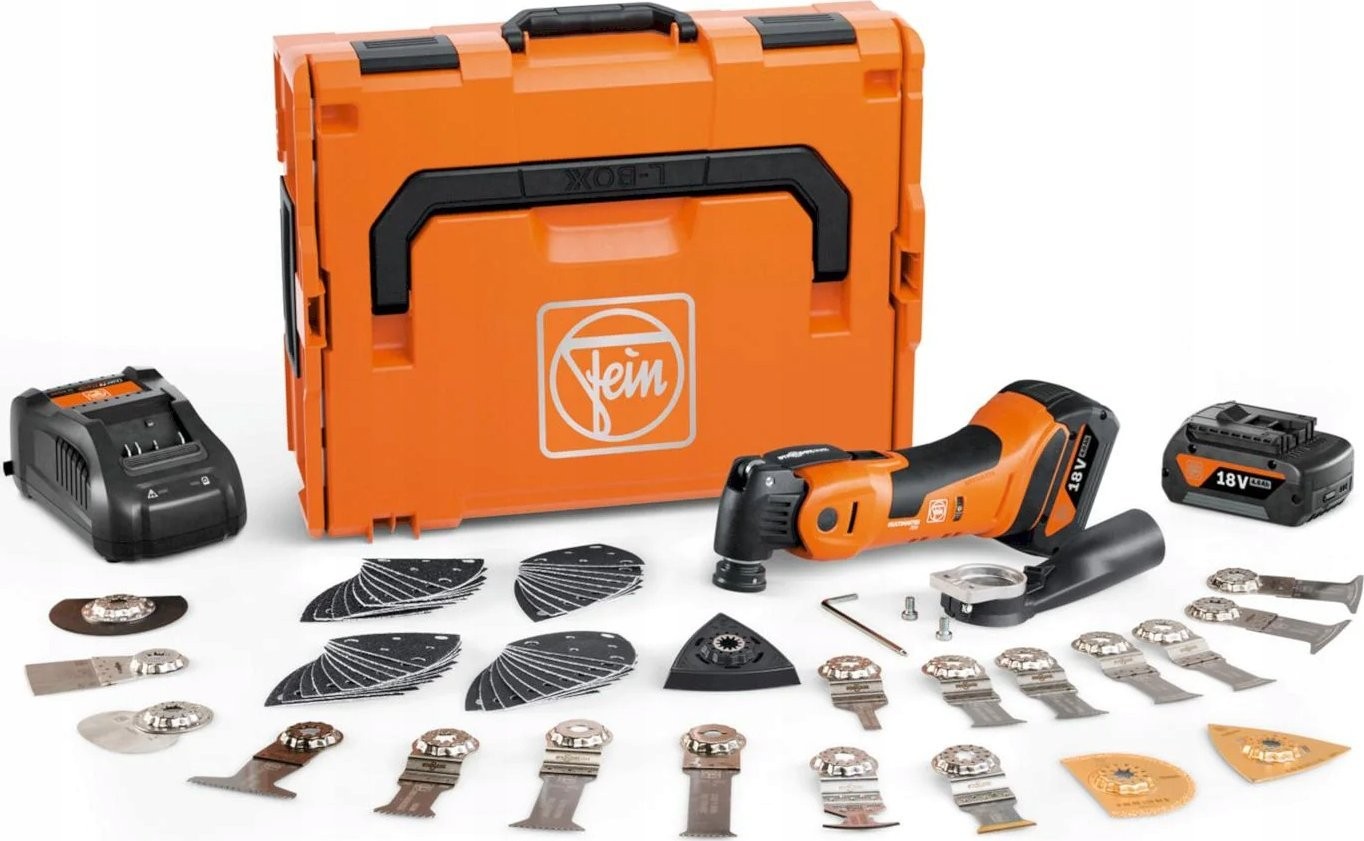 - Wyposażenie: 2 brzeszczoty E-Cut Standard curved (35 mm), 2 brzeszczoty E-Cut Standard curved (65 mm), 1 brzeszczot E-Cut Precision (35 mm), 1 brzeszczot E-Cut Precision (65 mm), 1 brzeszczot E-Cut Long Life (10 mm), 2 brzeszczoty E-Cut Long Life (35 mm), 1 brzeszczot E-Cut Long Life (32 mm), 1 brzeszczot E-Cut Long Life (42 mm), 1 brzeszczot E-Cut Carbide Pro (32 mm), 1 brzeszczot segmentowy (Ø 85 mm), 1 brzeszczot segmentowy z twardego stopu, 1 tarnik z twardego stopu (trójkątny), 1 szpachla, 1 nóż tnący, grzybkowy, 1 nóż wielofunkcyjny, 1 płytka ścierna z otworami, papier ścierny z otworami (10 arkuszy o ziarnistości 60, 80, 120, 180), 1 zestaw do odsysania pyłu, 1 ładowarka GAL 1880 CV, 2 akumulatory litowo-jonowe (18 V / 4 Ah), 1 plastikowa walizka na narzędzia (L-Boxx 136)