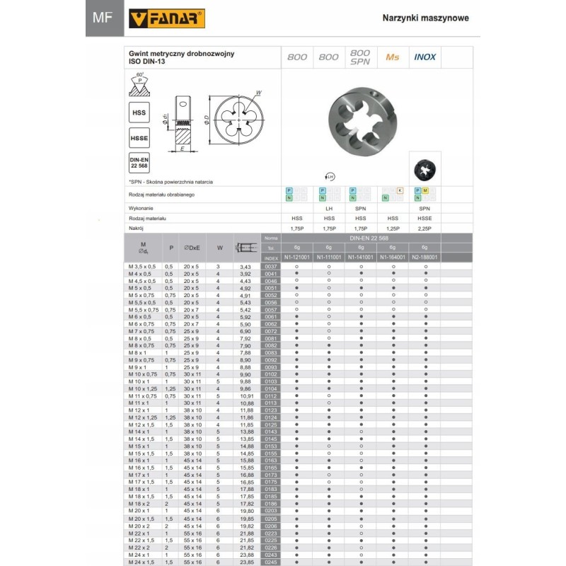 Specyfikacja techniczna Narzynki M24x1,5 DIN-22568 (6g) HSSE INOX