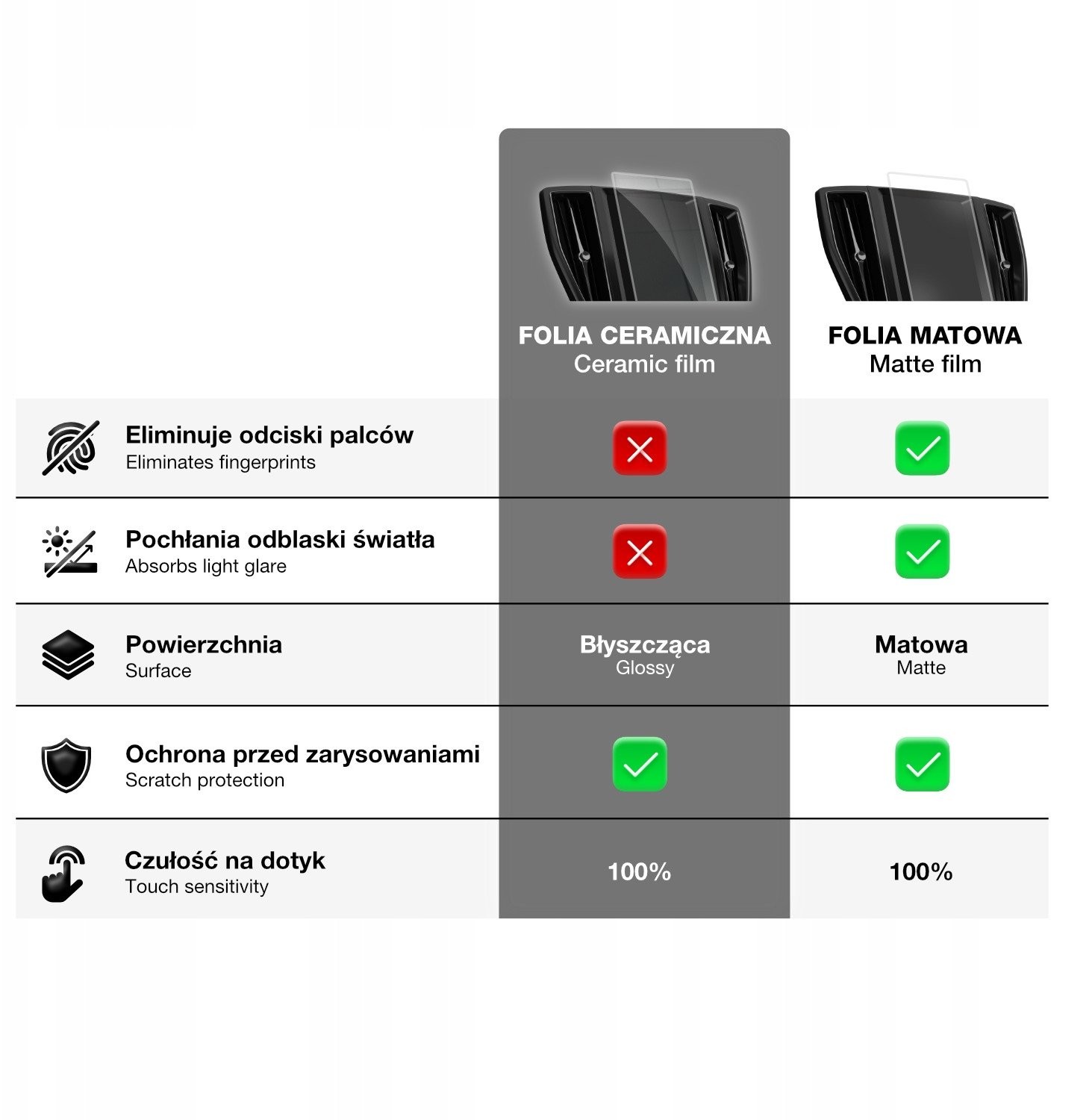 Folia została precyzyjnie wycięta przy użyciu technologii laserowej, co zapewnia doskonałe dopasowanie do ekranu. Jest niemal niewidoczna i eliminuje problem zapowietrzeń na krawędziach, co dodatkowo podnosi estetykę wnętrza pojazdu.