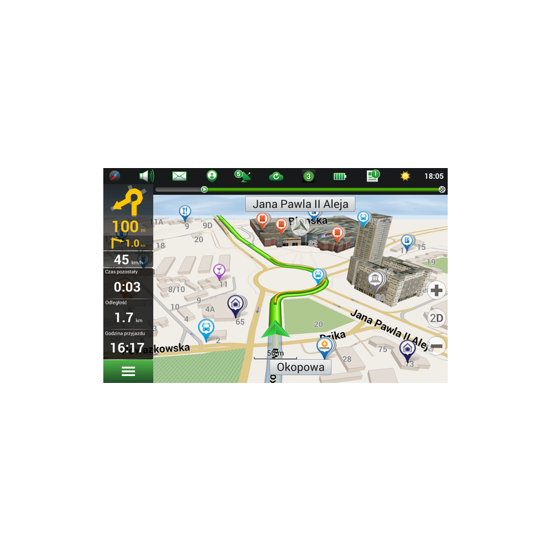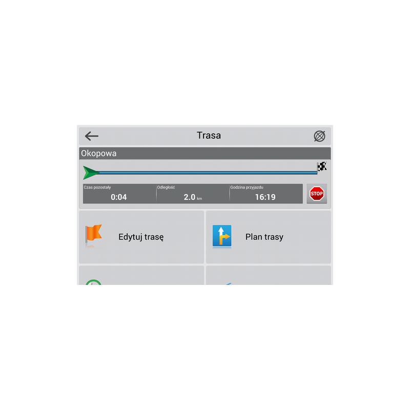 - Pasek trasy – użytkownik otrzymuje wszystkie istotne informacje o ruchu drogowym i podróży.