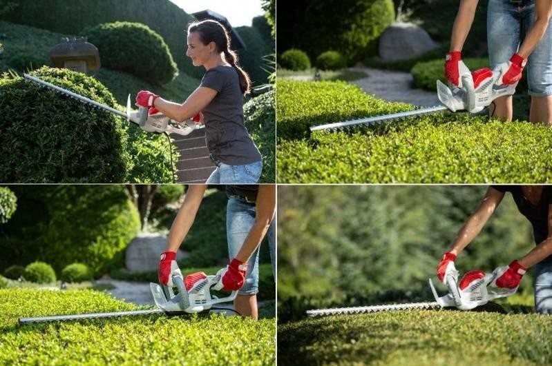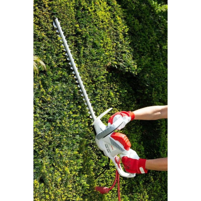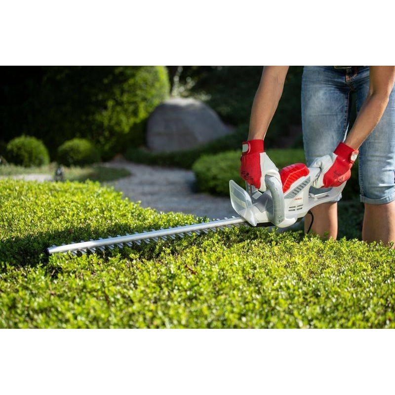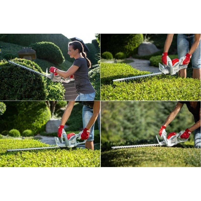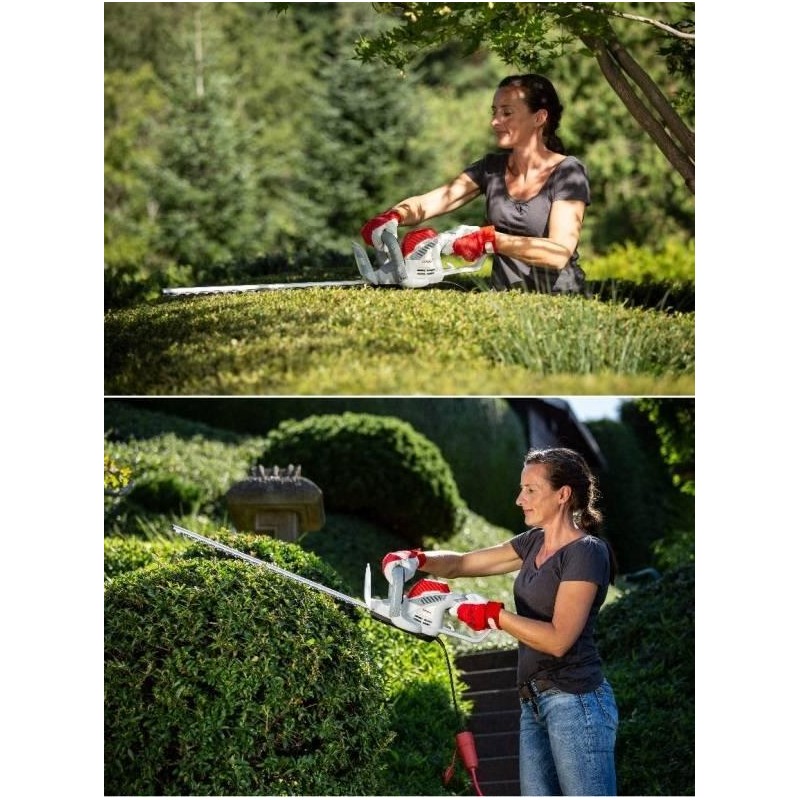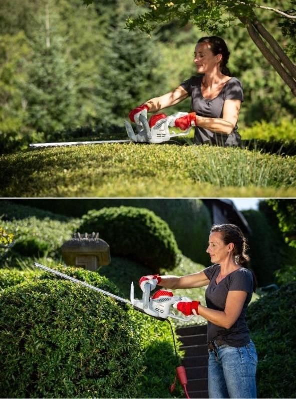 Elektrycznymi nożycami do żywopłotu można sprawnie pracować w ciągły sposób ponieważ energia jest w ciągły sposób dostarczana z gniazdka elektrycznego. Dzięki zewnętrznemu źródłu energii nożyce elektryczne są wyraźnie lżejsze od nożyc spalinowych. Energia dostarczana z gniazdka oznacza także, że nie musisz zwracać uwagi na czas ładowania akumulatora. Nie powstaną też przerwy w pracy spowodowane napełnianiem zbiornika i przygotowywaniem mieszanki. Elektryczne nożyce do żywopłotu IHT 550 posiadają metalową przekładnię co zapewnia niezawodność i trwałość urządzenia. W przypadku żywopłotów rosnących przy murze nie musisz się martwić, że uderzenie końcówką ostrzy w mur uszkodzi nożyce, ponieważ zostały one wyposażone w osłonę ostrzy zamontowana na ich końcówce. Dzięki temu dotkniecie muru końcówką ostrzy ich nie uszkodzi oraz zapobiega to odbiciu nożyc przez poruszające się ostrza. Osłona końcówki ostrzy pełni 3 ważne funkcje: chroni operatora przed odbiciem nożyc, chroni ostrza przed zniszczeniem oraz chroni mur przed uszkodzeniem.