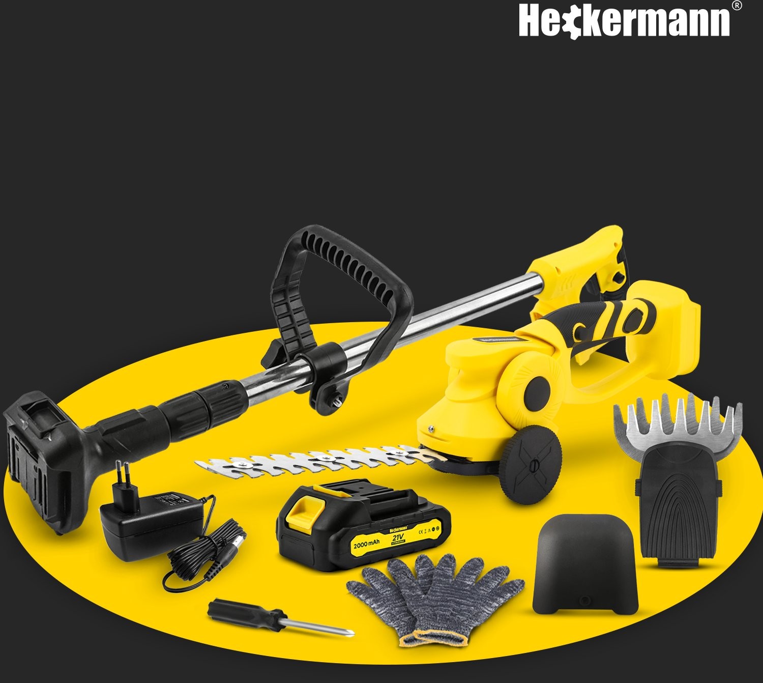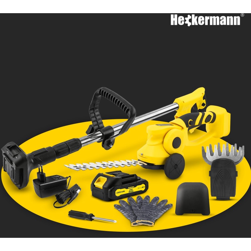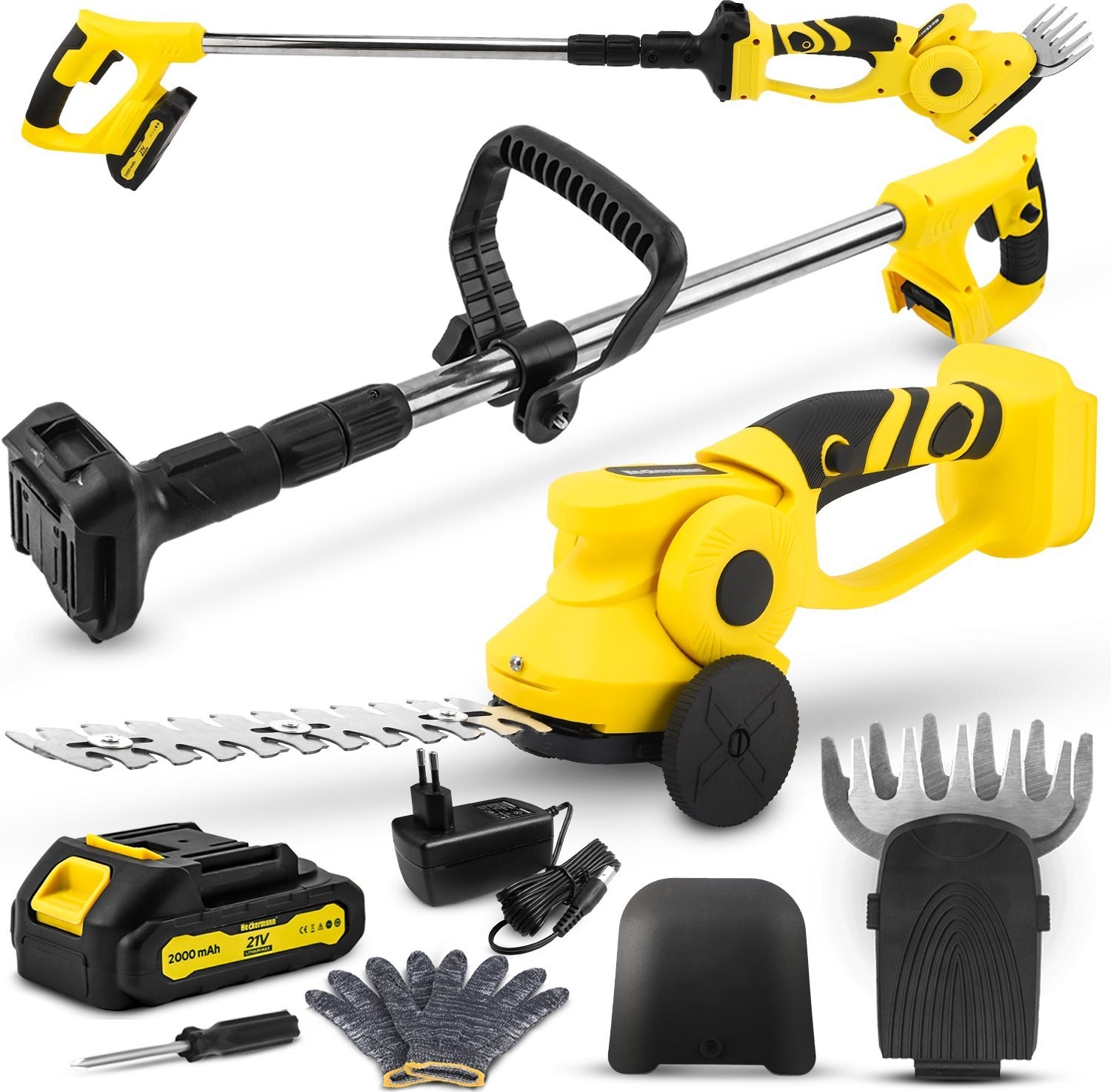 - W zestawie: nożyce, teleskopowa tyczka, ostrze do trawy, ostrze do żywopłotu, akumulator, ładowarka, zestaw osłon, rękawice ochronne