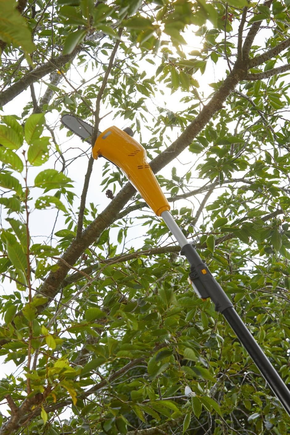 Podczas przycinania podkrzesywarką wysokiej jakości prowadnica dociera do najciaśniejszych miejsc i wokół nich a automatyczna pompa oleju zapewnia płynną pracę łańcucha.