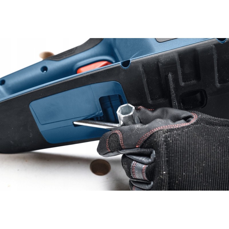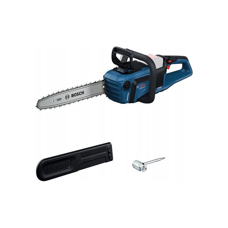 - Zestaw zawiera: piła BOSCH GHE 18V-60, osłona prowadnicy, klucz do regulacji naciągu łańcucha
