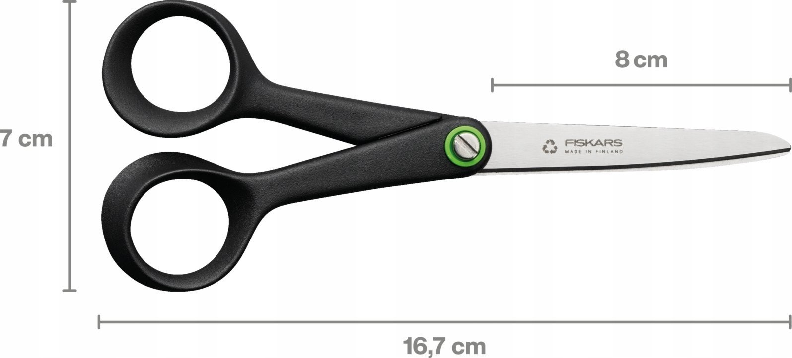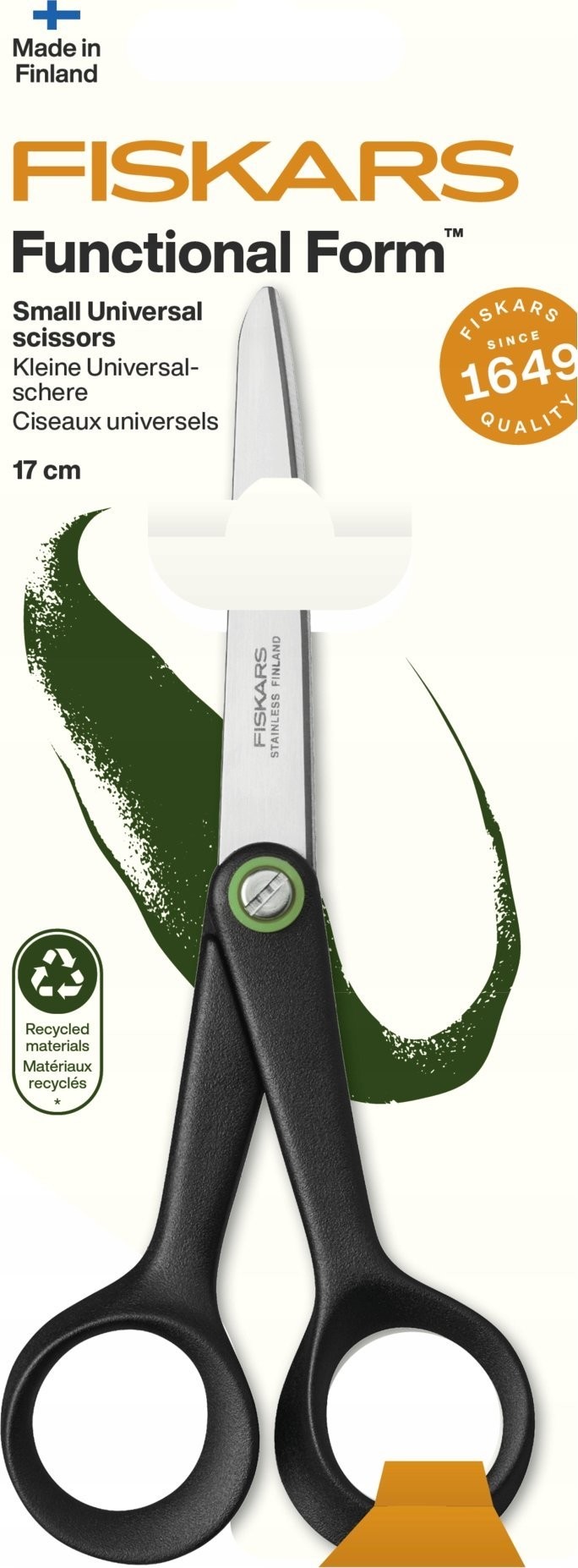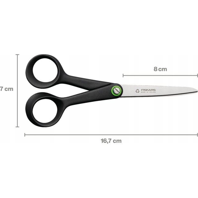 - Małe uniwersalne nożyczki Functional Form ReNew wykonane są z materiałów z recyklingu (minimum 70%), co zapewnia niesamowity komfort i niezwykłą wydajność cięcia.