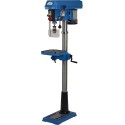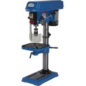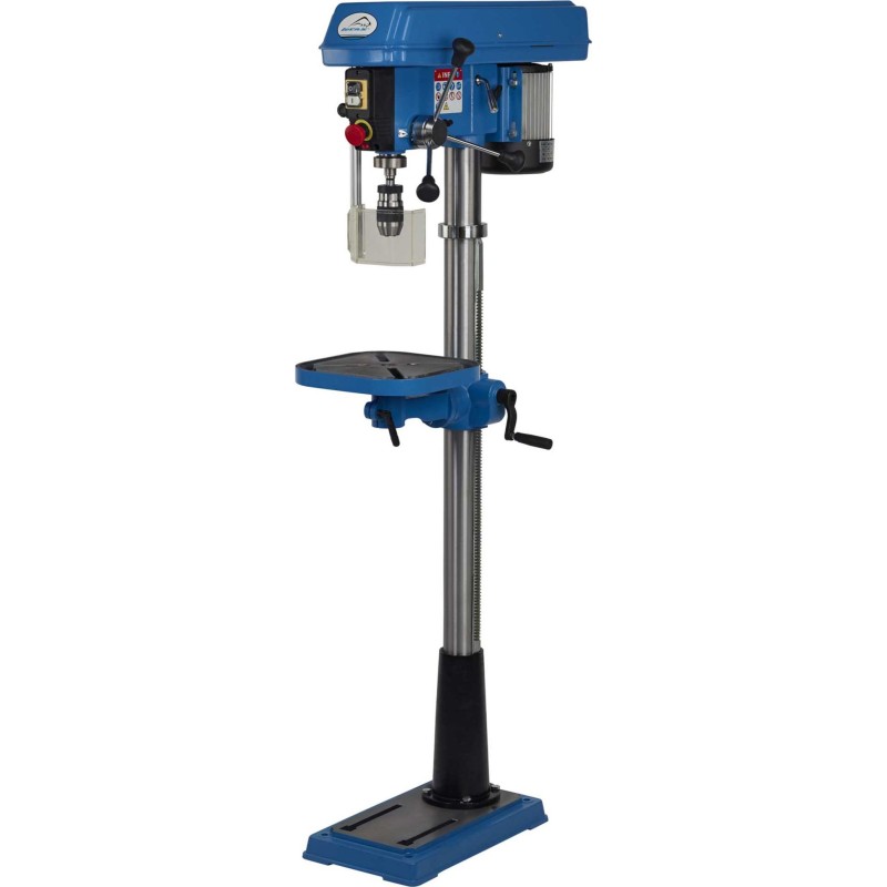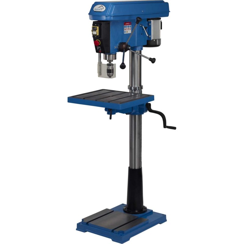 Obsługiwane ręcznie wiertarki stołowe i kolumnowe z napędem pasowym. Do warsztatów i lżejszego przemysłu. Pasowa przekładnia zmiany prędkości, 3-ramienna dźwignia posuwu pionowego wrzeciona. Regulacja wysokości stołu wzdłuż listwy zębatej, przechył blatu w zakresie 45°-0°-45° z wykorzystaniem podziałki kątowej, ponadto możliwość odchylania stołu na boki. Wrzeciono łożyskowane kulkowo. Nastawianie głębokości wiercenia z wykorzystaniem podziałki. Krzyż laserowy do dokładnego wyznaczania punktu wiercenia. Osłona ochronna wiertła z mikrowyłącznikiem, o regulowanej wysokości usytuowania. Dostarczane w komplecie z uchwytem wiertarskim 16 mm, trzpieniem do uchwytu wiertarskiego, klinem do wybijania wiertła i różnymi kluczami trzpieniowymi sześciokątnymi, silnikiem o stałej prędkości i klasie szczelności IP 20. 3-żyłowy kabel zasilający oraz wyłącznik zwalniany przy zaniku napięcia.