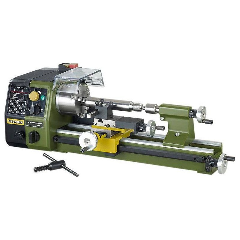 Uchwyt tokarski: Wysokiej jakości trójszczękowy uchwyt tokarski według normy DIN 8386 Klasa 1 (tolerancja współosiowości: 0.04mm). Zakres wielkości obrabianych przedmiotów: od 2 do 75mm dzięki możliwości odwrotnego montażu szczęk. W zestawie z osłoną uchwytu tokarskiego z wyłącznikiem bezpieczeństwa.