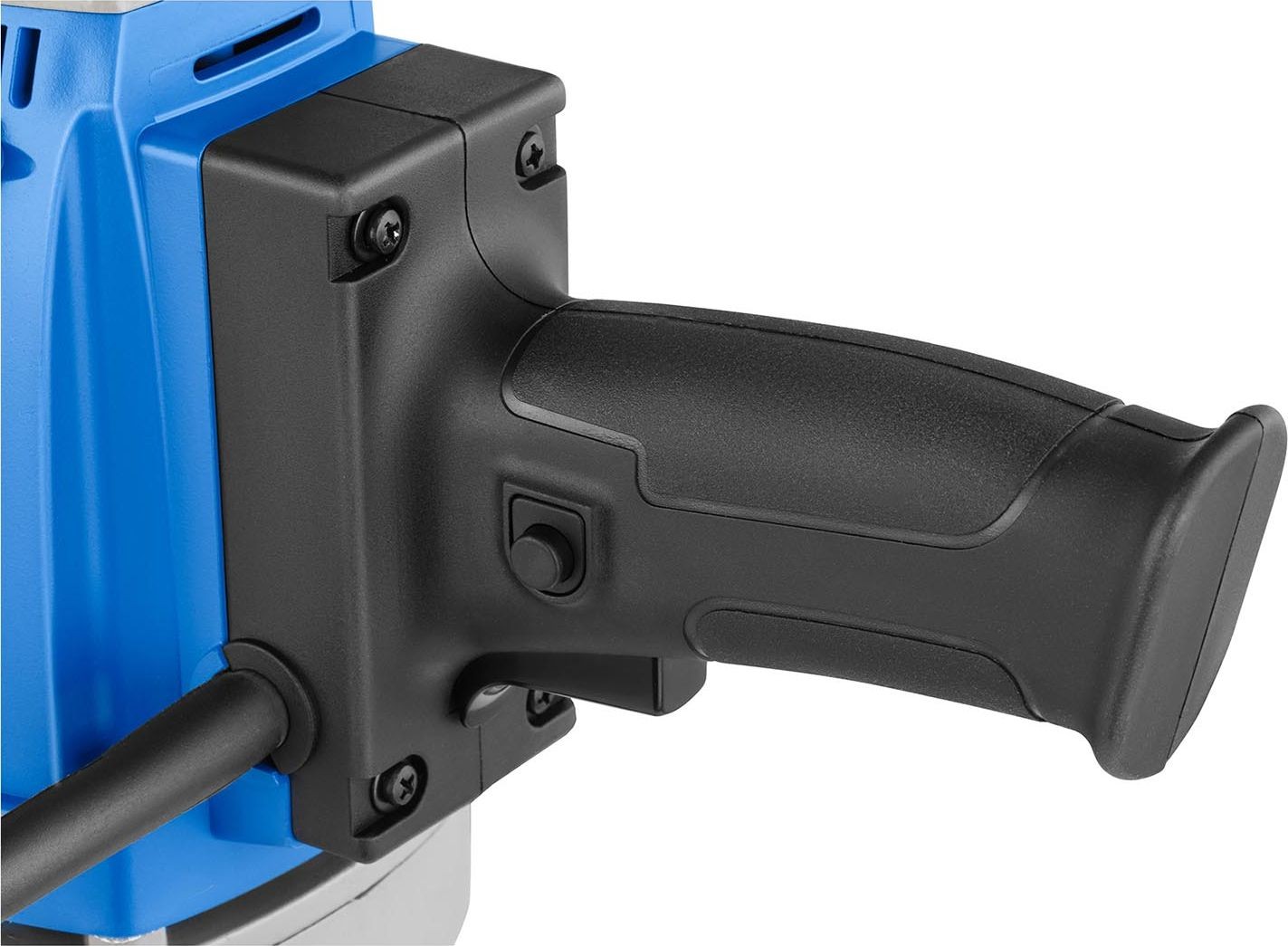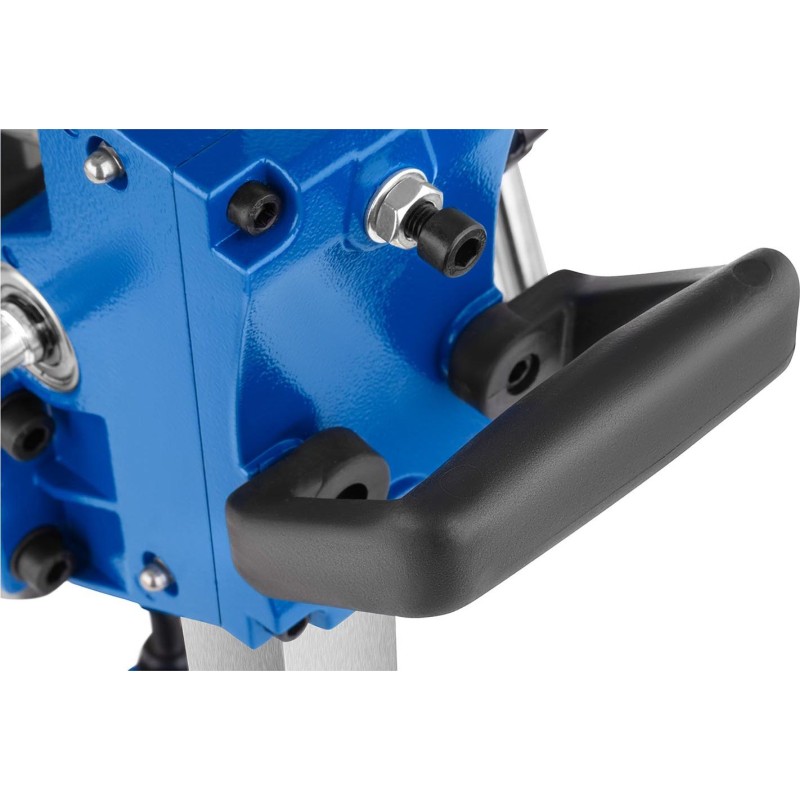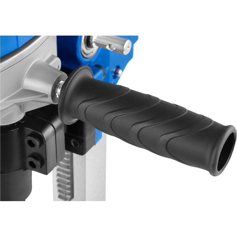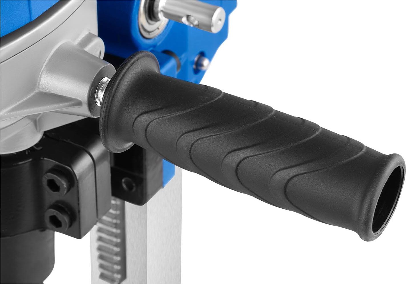 Wiertnica nadaje się również do pracy ręcznej, wystarczy odmontować ją z podstawy. Dzięki umieszczeniu włącznika w rączce oraz zamontowaniu specjalnego wspornika na ramię, korzystanie z urządzenia tym trybie jest komfortowe. Dla ułatwienia pracy ciągłej zastosowano także blokadę włącznika.