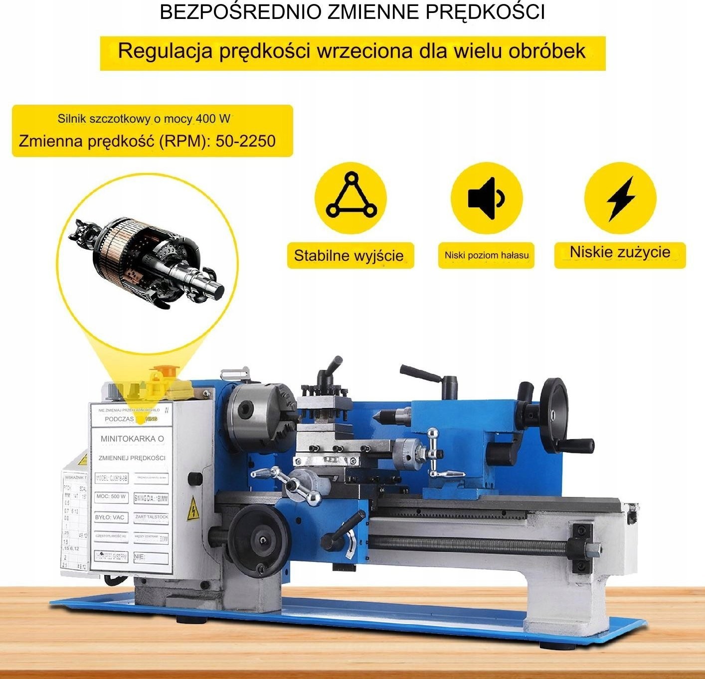 Łoże mini tokarki wykonane jest ze wysokiej jakości stali. Wyposażona w nylonowe koła zębate tokarka jest odporne na zużycie, trwała i profesjonalna. Moc silnika mini tokarki do metalu: 400W. Osłona przeciwbryzgowa na całej długości zapewnia maksymalną ochronę.