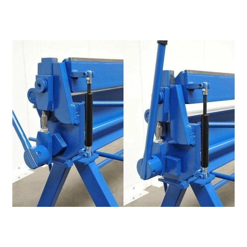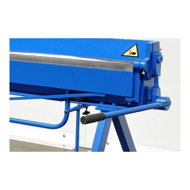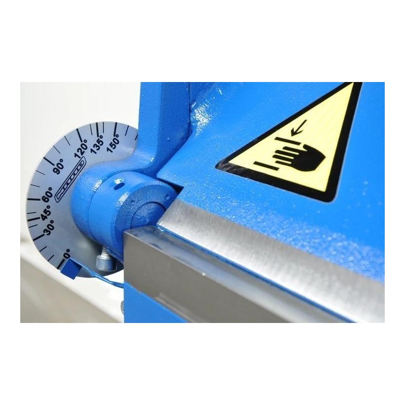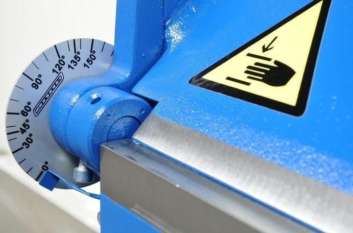 Operacji zaginania dokonuje się poprzez obrót za pomocą uchwytu o określoną wartość kątową belki gnącej. Kątomierz zamocowany po lewej strony zaginarki patrząc od przodu wskazuje aktualny kąt zagięcia blachy.