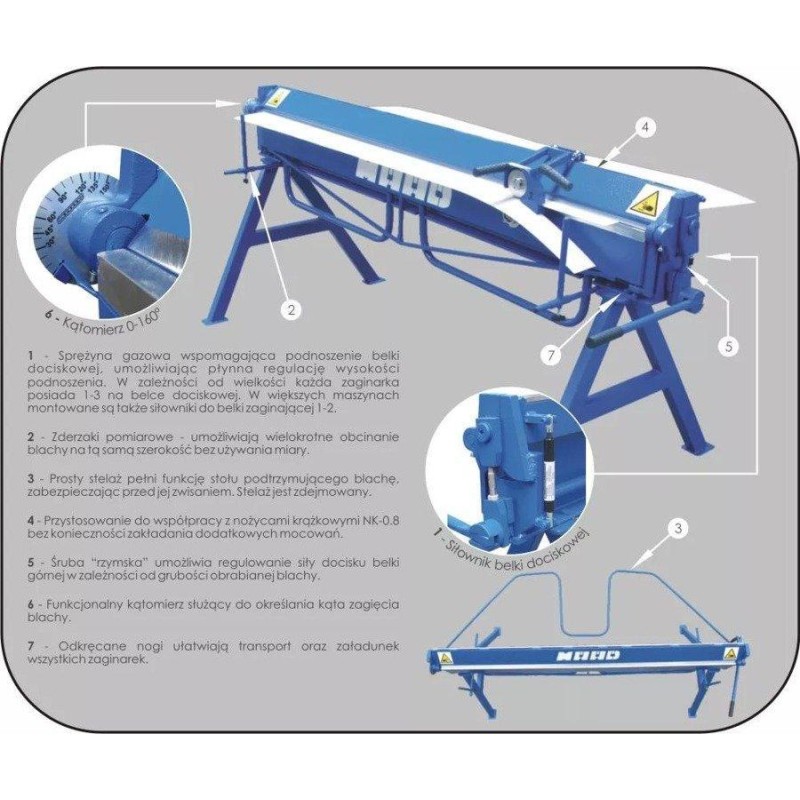 Maszyna oprócz standardowych sprężyn gazowych przy belce dociskowej posiada dodatkowo jedną sprężynę gazową wspomagającą belkę zaginającą o sile 850 N. Masywniejsze i wzmocnione mechanizmy boczne maszyny (zastosowanie mechanizmów o 40% większych w stosunku do zaginarki ZG-1400/1.5) oraz przekroje belek roboczych zaginarki pozwalają giąć blachę stalową o grubości do 2.0 mm dla granicy plastyczności do 400 MPa. Mimo małych gabarytów maszyna posiada masę aż 230 kg, co jest jej jedną z najważniejszych zalet!