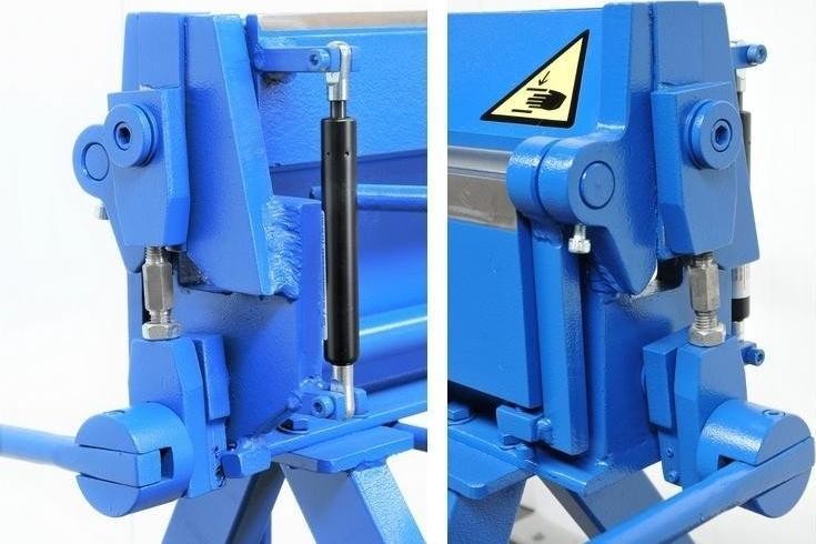 - Sprężyny gazowe wspomagają podnoszenie belki dociskowej, umożliwiając płynną regulację wysokości podnoszenia. W zależności od wielkości każda zaginarka posiada 1 lub 2 sprężyny gazowe.