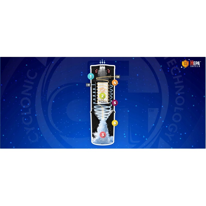 Wciągane zanieczyszczenia są kierowane ruchem cyklonicznym ku dołowi i umieszczane w kuble, a filtracja Hepa Shield wyłapuje pozostałe 2% zanieczyszczeń, dzięki czemu odkurzacz wyrzuca krystalicznie czyste powietrze.