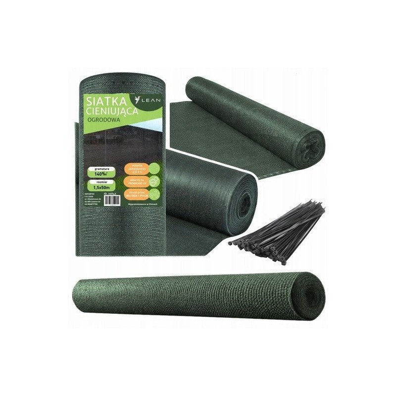 - Zawartość zestawu: Siatka cieniująca 1,5 x 50 m, 60 opasek zaciskowych