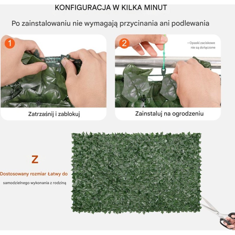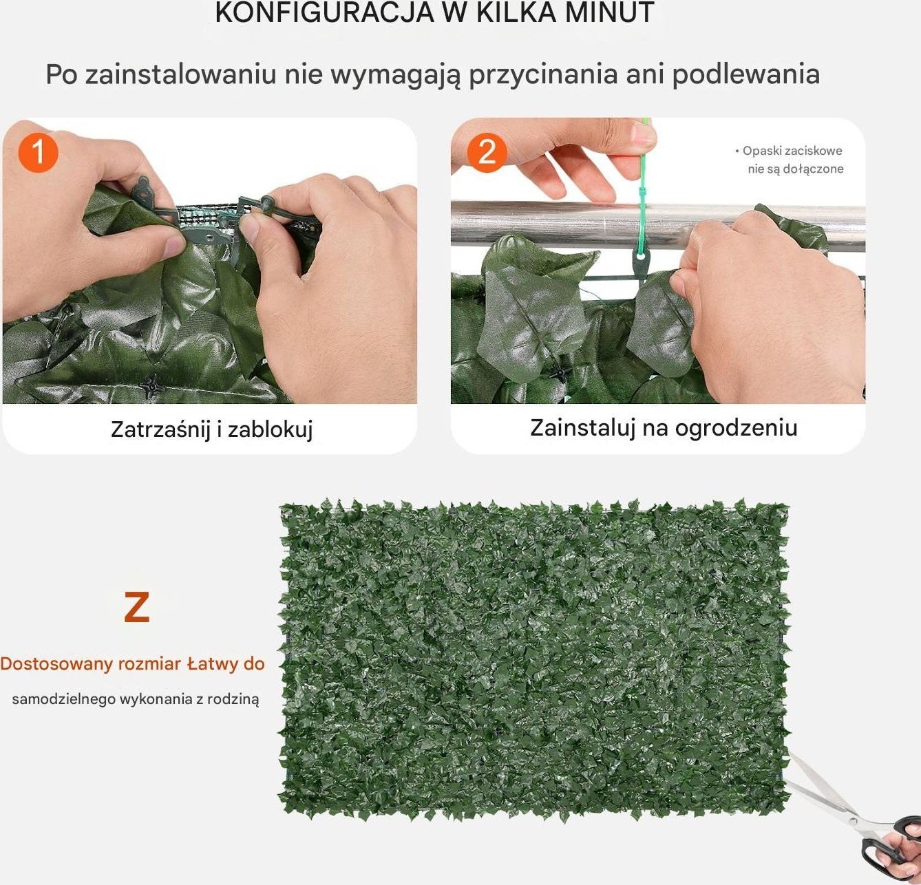 Instalacja sztucznego żywopłotu jest niezwykle prosta i szybka. Elastyczna siatka wzmacniająca pozwala na łatwe dopasowanie do różnych powierzchni, co sprawia, że montaż jest wygodny i bezproblemowy.