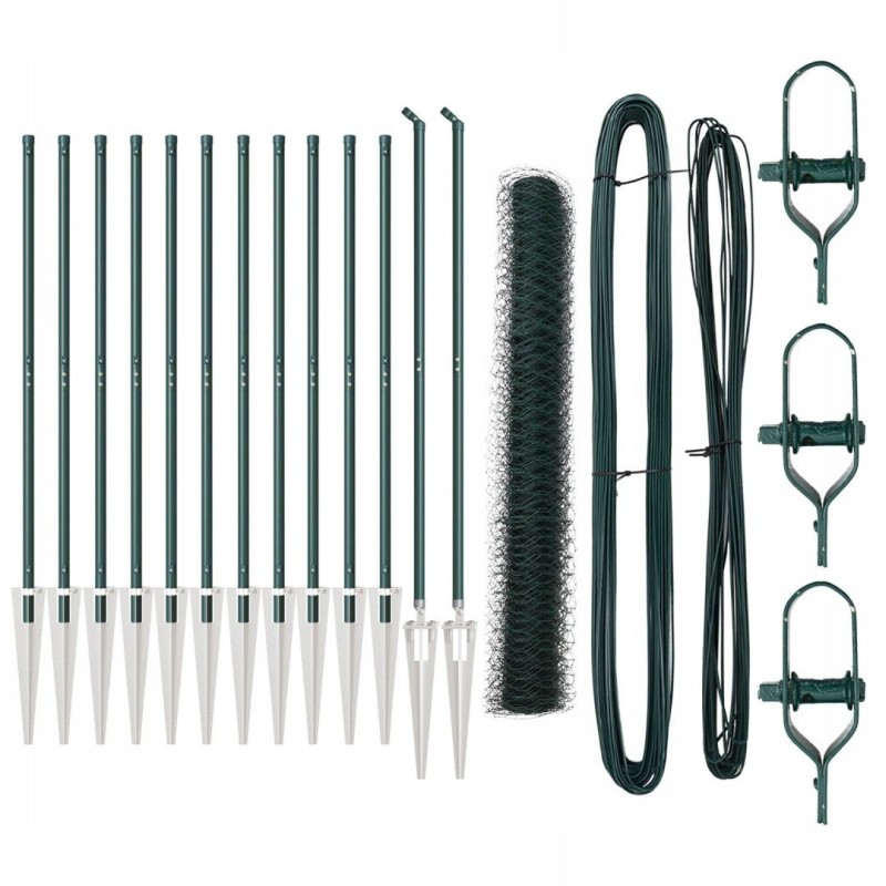 Specyfikacja techniczna vidaXL Heksagonalne ogrodzenie Zielone 1.4x25 m Stal, Słupki ogrodzeniowe z kolcem 13 szt. Ø32 mm 160 cm Stal ocynkowana