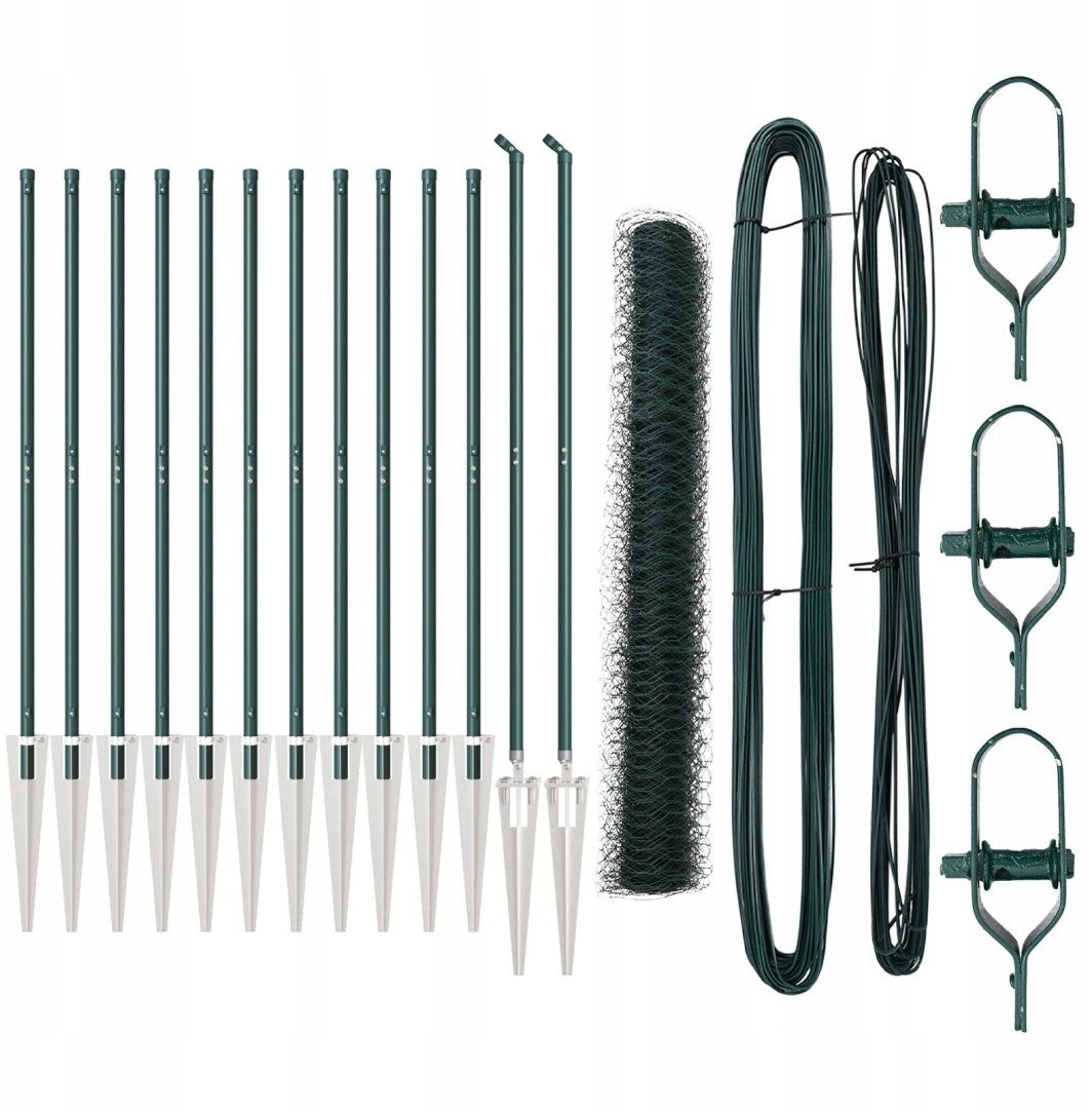 vidaXL Heksagonalne ogrodzenie Zielone 1.4x25 m Stal, vidaXL Słupki ogrodzeniowe z kolcem 13 szt. 32 mm 160 cm Stal ocynkowana