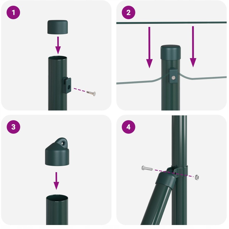 Montaż ogrodzenia jest prosty i szybki, wymagający jedynie dwóch osób oraz podstawowych narzędzi, takich jak młotek i klucz. Produkt zapewnia solidne mocowanie, co gwarantuje jego stabilność nawet w wietrze. W zestawie znajdują się dwa elementy ogrodzenia.