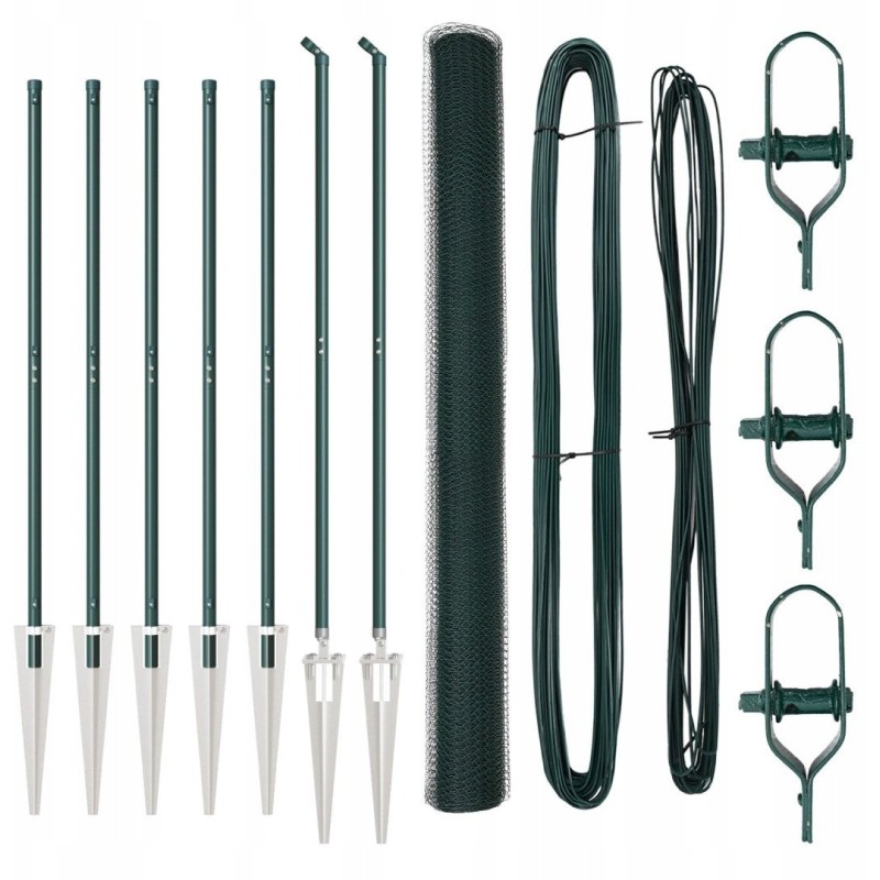 W skład zestawu wchodzi 7 słupków ogrodzeniowych o średnicy 32 mm i wysokości 170 cm, co zapewnia stabilność oraz trwałość całej konstrukcji. Zestaw zawiera wszystkie niezbędne elementy do montażu, w tym siatkę, kotwy oraz drut, co ułatwia szybkie i efektywne postawienie ogrodzenia.