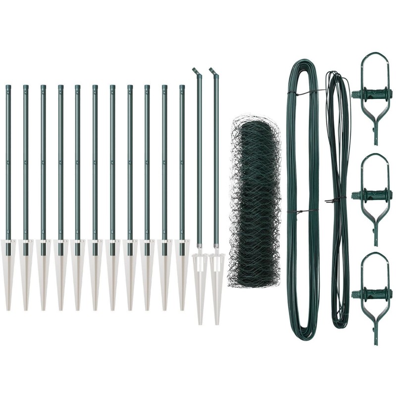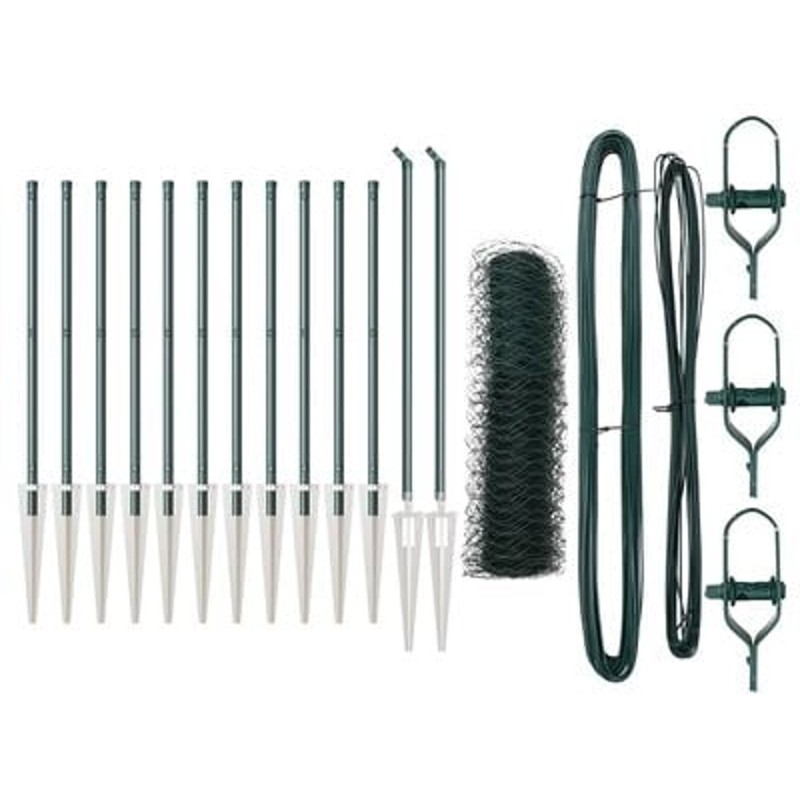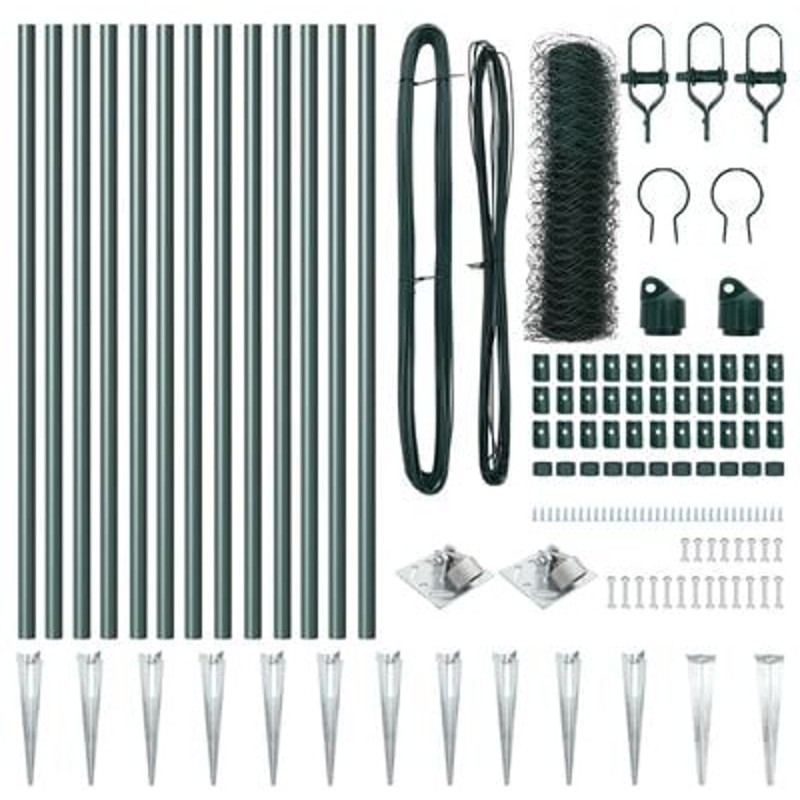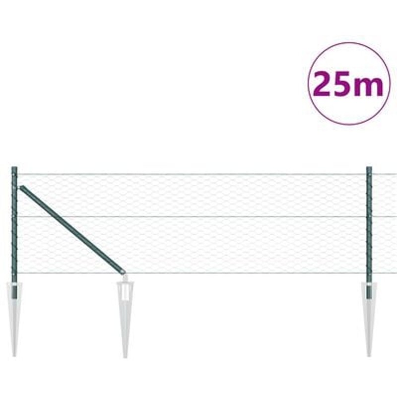 Płot heksagonalny vidaXL Zielony 0.6x25 m Stal, Słupki ogrodzeniowe vidaXL z kotwą 13 szt. 32 mm 80 cm Stal ocynkowana