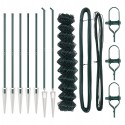 - Dostarczane komponenty: 6 prętów ze śrubami mocującymi, siatka, drut wiążący, zatrzaski do bramy