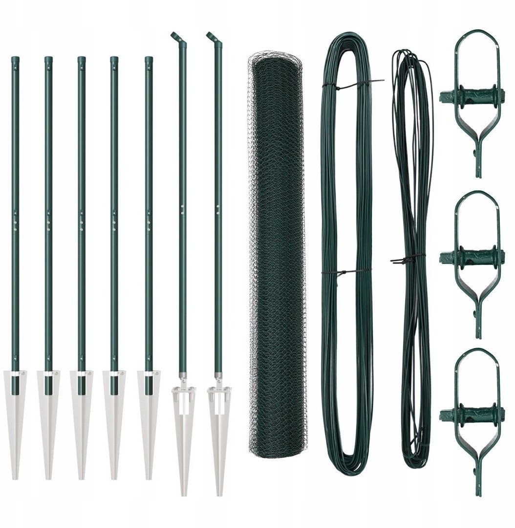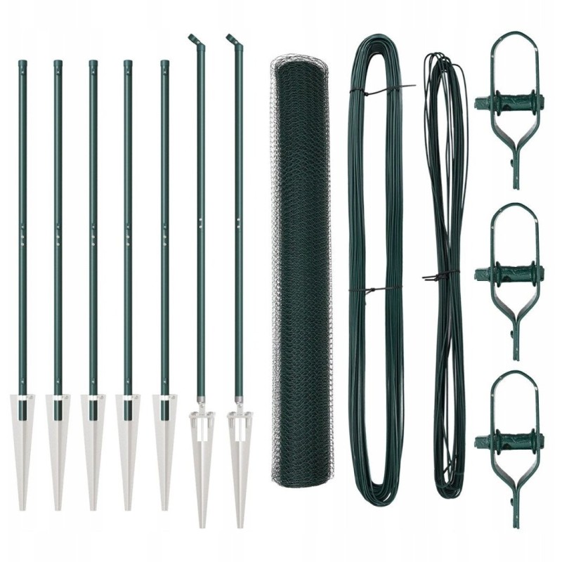 - Zawartość zestawu: 6 słupków, 1 rolka siatki, 3 kotwy, 1 szpula drutu