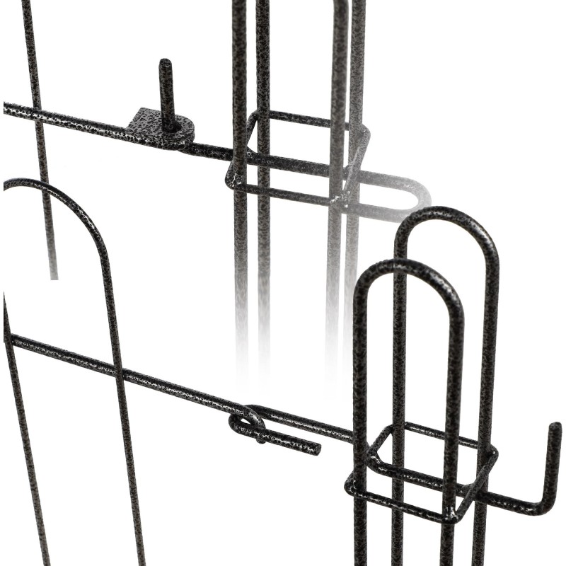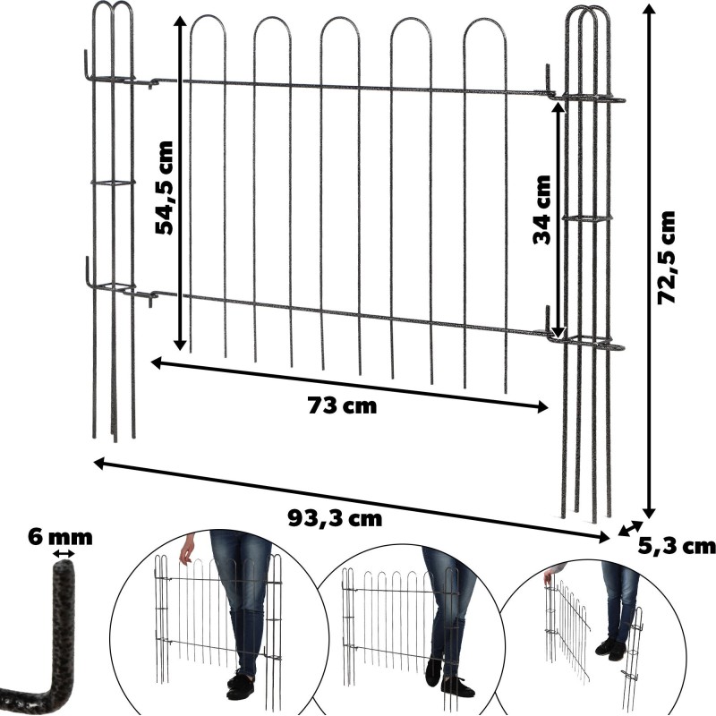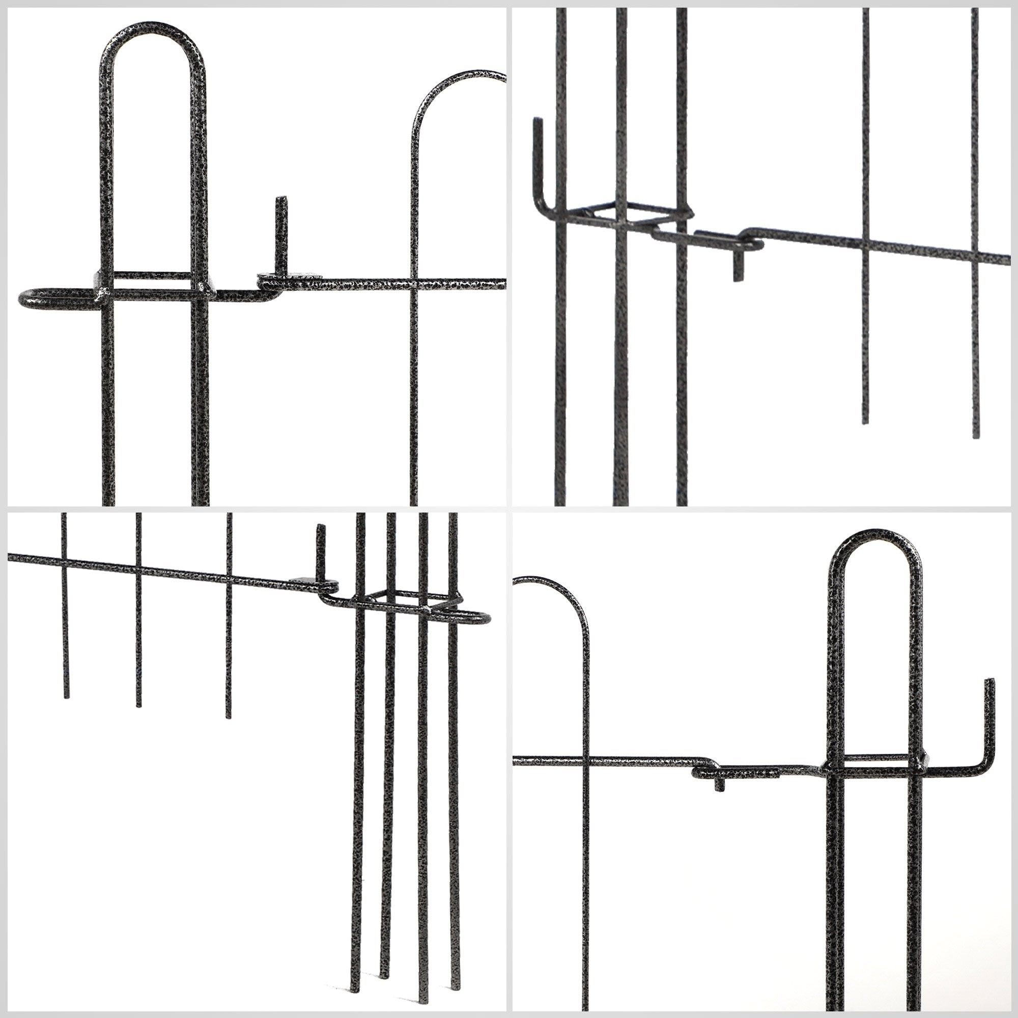 Zarówno płotek jak i furtka ogrodowa posiadają zaczepy metalowe, dzięki którym w bardzo łatwy, wygodny i szybki sposób można spinać ze sobą poszczególne panele. Montaż nie wymaga użycia narzędzi. Po spięciu płotków ze sobą i zamontowaniu furtki ogrodowej należy je następnie wbić w podłożę, co też nie wymaga użycia narzędzi. Konstrukcja wykonana jest ze zgrzanych ze sobą sztywnych prętów metalowych. Całość jest malowana proszkowo farbami fasadowymi, odpornymi na warunki atmosferyczne.