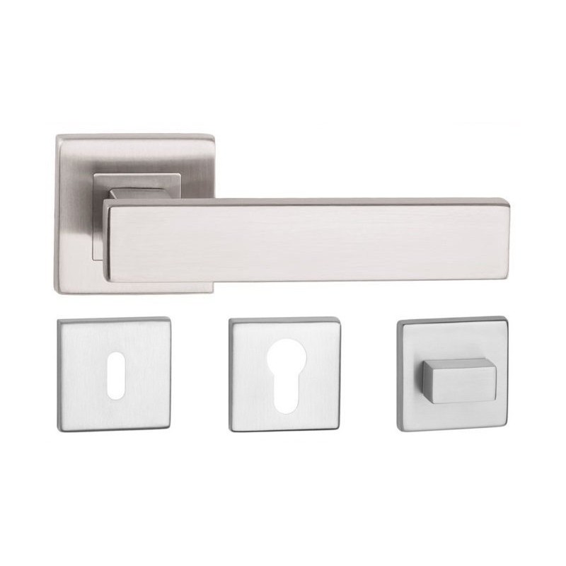 W zestawie znajdują się dwie klamki (prawa i lewa), elementy montażowe oraz estetyczne opakowanie fabryczne. Klienci mają także możliwość wyboru różnych szyldów dolnych, takich jak klucz, wkładka czy blokada WC, co pozwala na dostosowanie klamki do indywidualnych potrzeb.
