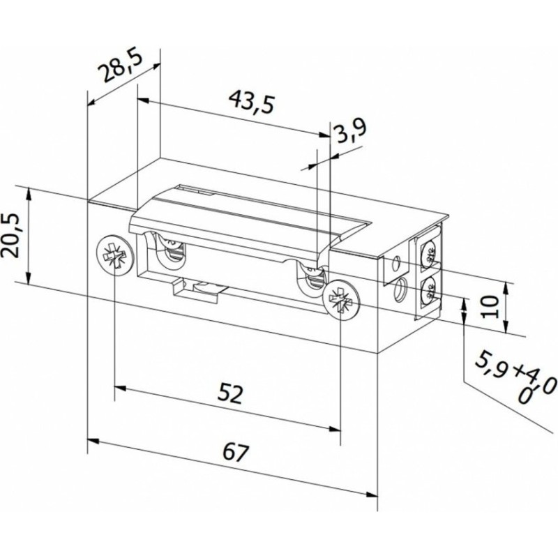 Rygiel elektromagnetyczny, symetryczny z wyłącznikiem. Niezbędny element systemu domofonowego (wideodomofonowego) montowany przy furtce, służący do jej zdalnego otwierania.Wyłącznik służy do pozostawiania rygla w pozycji "otwarty" - furtkę można wielokrotnie otwierać i zamykać bez konieczności zdalnego uruchamiania rygla. Symetryczne rozmieszczenie zapadki umożliwia instalacje rygla zarówno do prawych, jak i lewych drzwi. Napięcie zasilania 12 V AC/DC, pobór prądu podczas pracy 400/480 mA. Konserwacja, przed przystąpieniem do konserwacji należy odłączyć zasilanie. Elektrozaczepy nie mogą być czyszczone za pomocą materiałów ściernych lub żrących. Należy czyścić je za pomocą wilgotnej szmatki. Nie rozpylać aerozolu, nie oliwić ani też nie smarować elektrozaczepu.