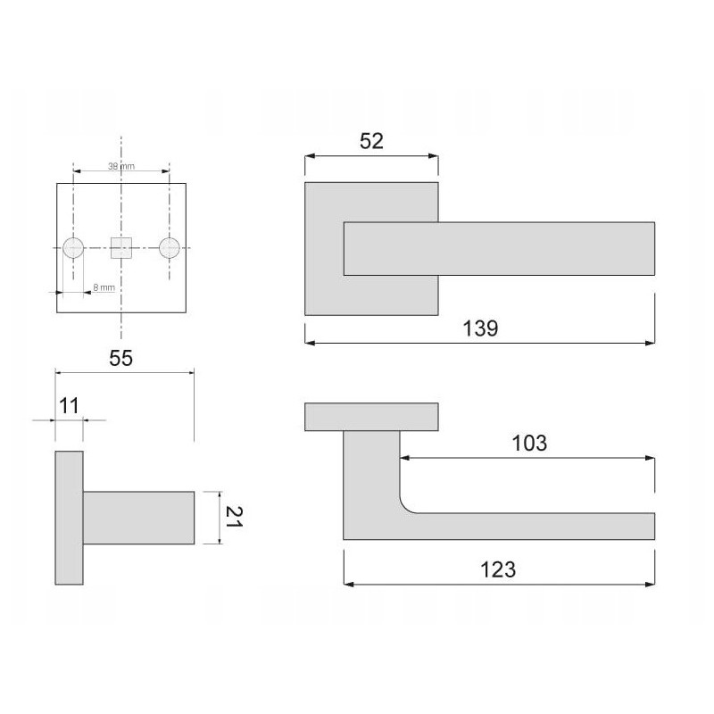 Wymiary klamki: Długość rączki 123 mm, całkowita wysokość 55 mm