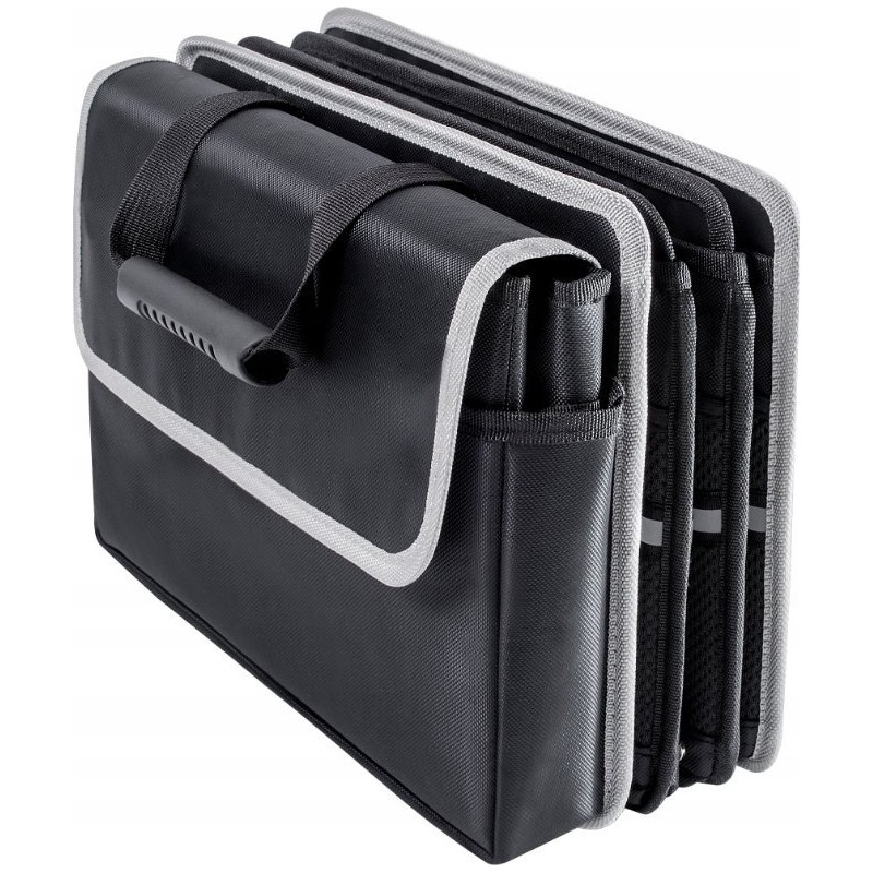 Dzięki 3 podzielnym przegrodom można go złożyć do mniejszych rozmiarów i wykorzystać jako mniejszą torbę. Nieużywana torba może być złożona i zabezpieczona klamrami zatrzaskowymi, nie zajmuje dużo miejsca. Dodatkowo torba ma naszyte rzepy i napki , które zabezpieczą organizer przed ewentualnym rozłożeniem