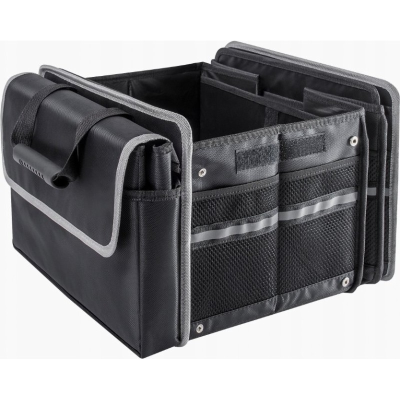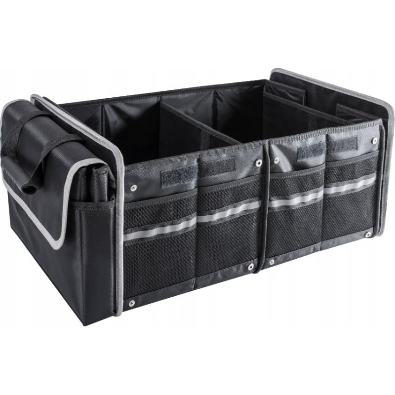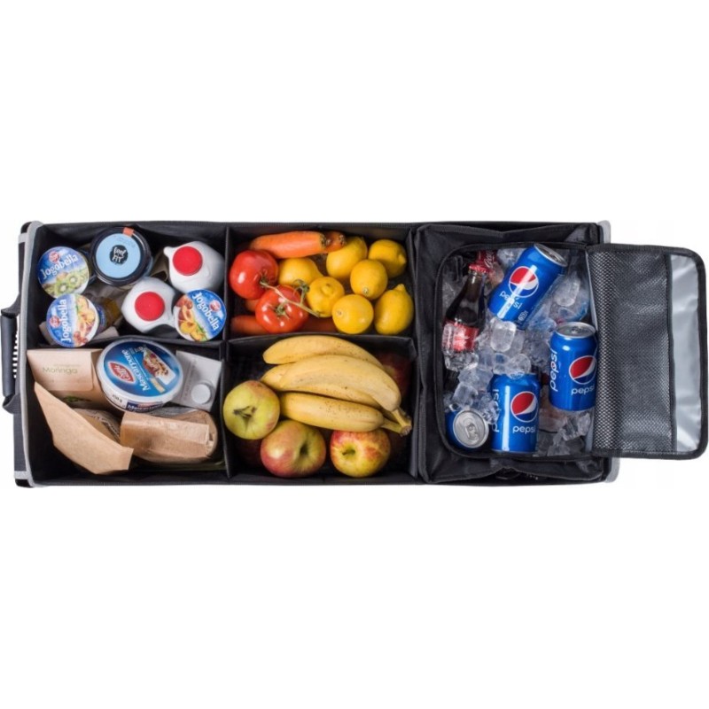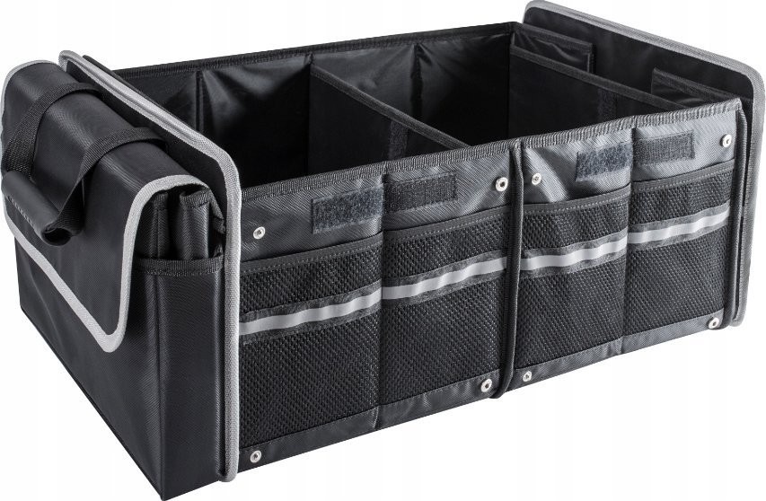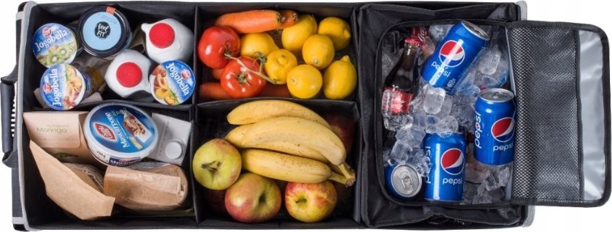- Dobrze zaprojektowany - 3 duże solidne przegrody wewnątrz organizera z oddzielną, wyjmowaną torbą termiczną na zakupy lub napoje, 12 zewnętrznych kieszonek z elastycznej siatki, usztywniane dno torby, solidne uchwyty, duża zewnętrzna kieszeń zapinana na rzep, pokrywa zabezpieczająca
