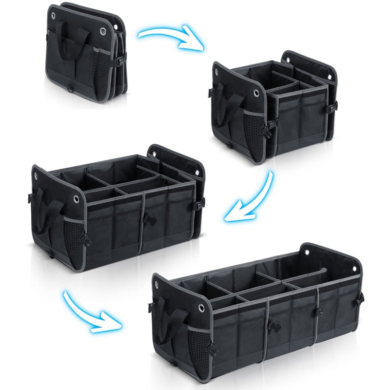 Dzięki antypoślizgowym rzepom na spodzie nie przesuwa się w bagażniku na zakrętach ani przy hamowaniu, zapewniając maksymalną stabilność i bezpieczeństwo przechowywanych rzeczy.