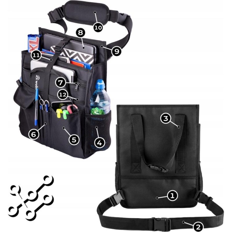 - Dodatkowe uchwyty z regulacją długości do przeobrażenia organizera w podręczną torbę z miękką podkładką na ramię