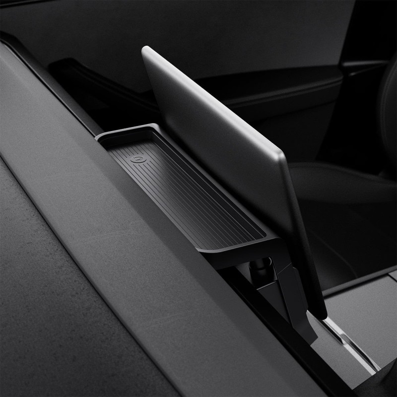 Dodatkowa półka umieszczona za wyświetlaczem opiera się o deskę rozdzielczą, tworząc dyskretną przestrzeń na przedmioty. Subtelny design organizera idealnie współgra z eleganckim wnętrzem Tesli, sprawiając wrażenie fabrycznego rozwiązania.