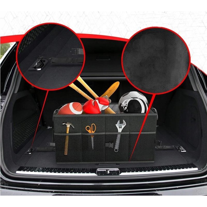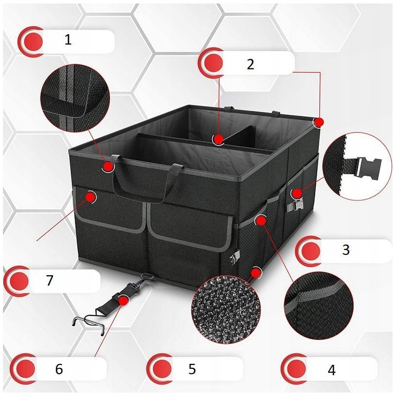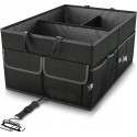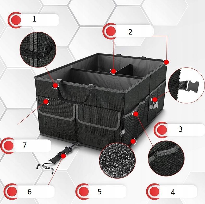 Składany praktyczny organizer do bagażnika samochodu, dzięki któremu zadbasz o porządek w swoim aucie. Organizer wyposażony jest w 4 komory. Bez trudu pomieści wszystkie podręczne przedmioty, które będą miały swoje stałe miejsce. Zadbaj także o bezpieczeństwo i porządek - przedmioty podczas gwałtownych manewrów nie porozrzucają się po aucie.