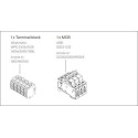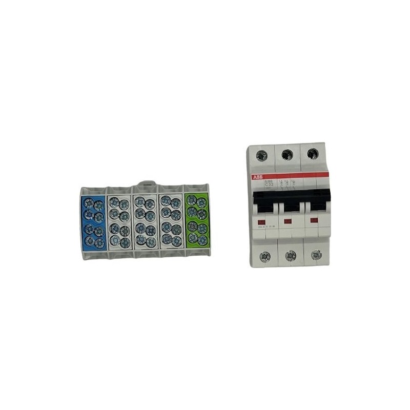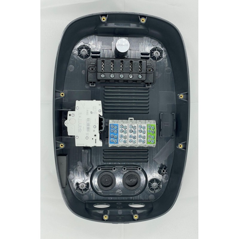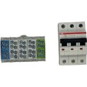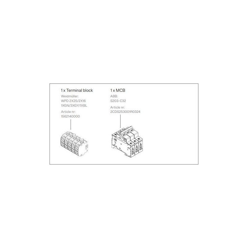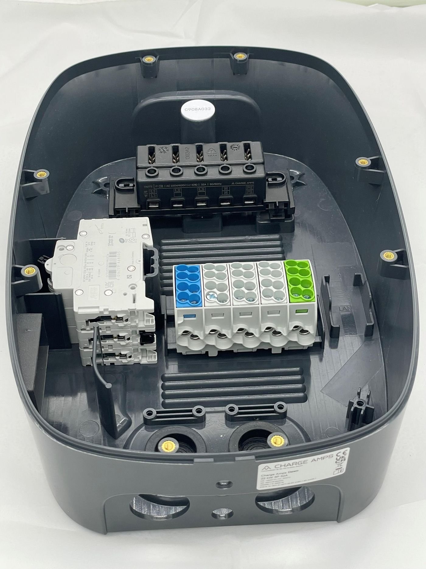Listwa zaciskowa i MCB razem w zestawie instalacyjnym dla Charge Amps Dawn. Używane, gdy chcesz umieścić MCB wewnątrz Charge Amps Dawn.