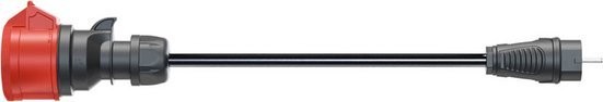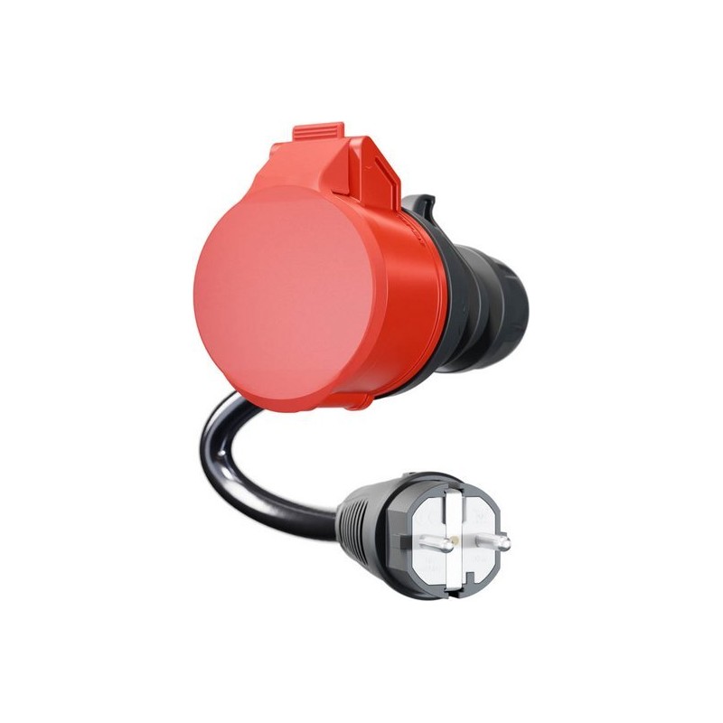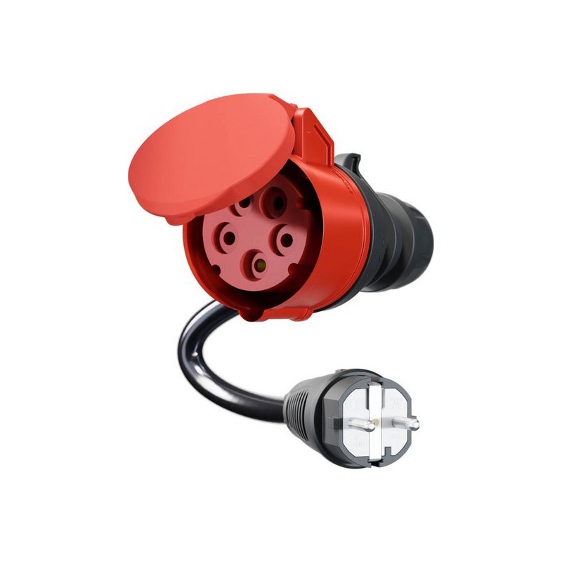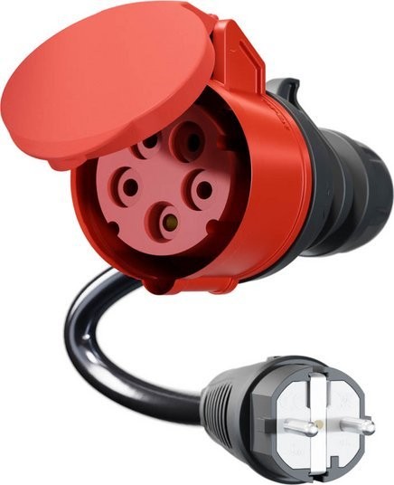 Kabel adapterowy do ładowarki go-e Gemini flex 11 kW z czerwoną wtyczką 16 A CEE (prąd trójfazowy). Adapter umożliwia podłączenie do domowych gniazdek elektrycznych.