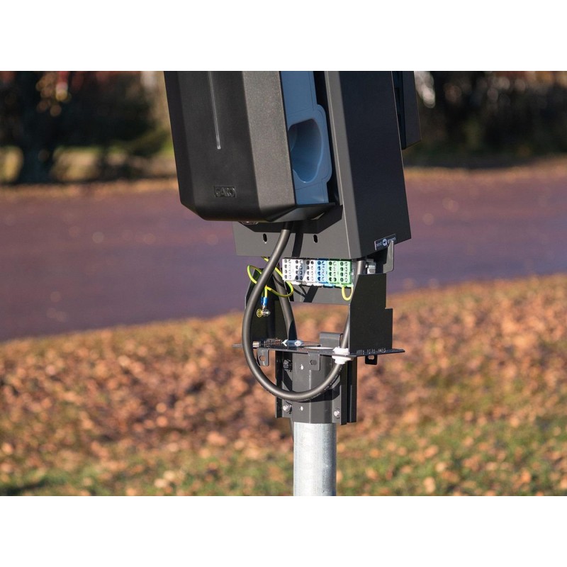 Polebox to uchwyt słupowy do skrzynek ładowania, przeznaczony do montażu na stalowej rurze o średnicy Ø 60 mm. Produkt jest przeznaczony do prowadzenia kabli elektrycznych wewnątrz rury słupa ładowania.