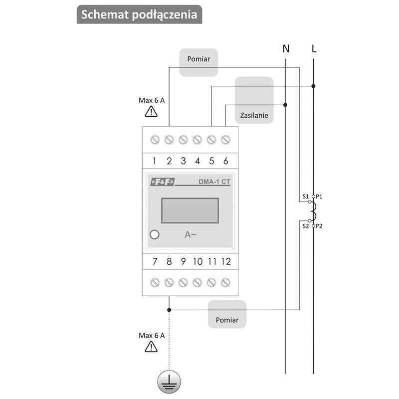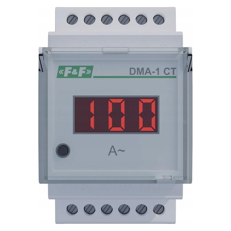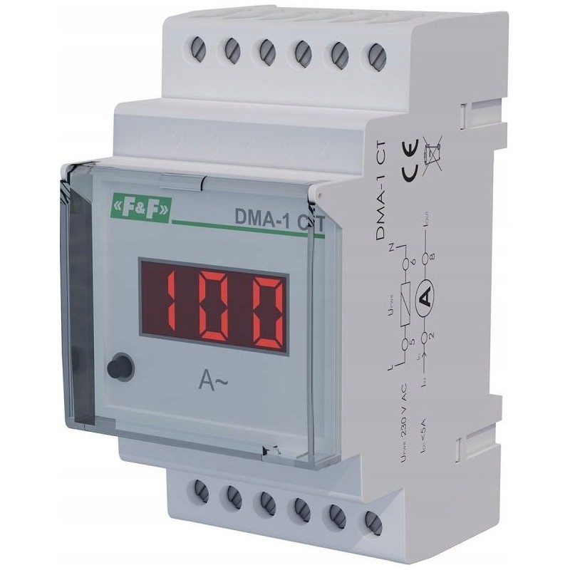 F&F Amperomierz cyfrowy F&F DMA-1-CT jednofazowy pomiar półpośredni z przekładnikiem 5A na szynę DIN