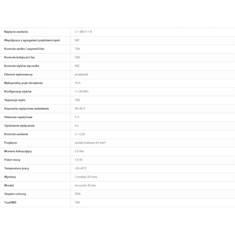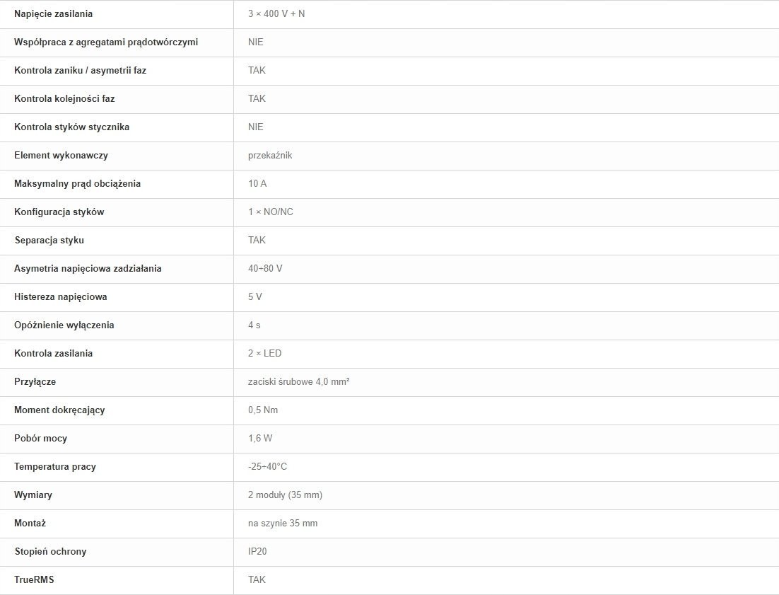 Brak napięcia w co najmniej jednej, dowolnej fazie lub asymetria napięciowa między fazami powyżej progu zadziałania spowoduje wyłączenie silnika. Wyłączenie nastąpi z opóźnieniem 4 s, co zapobiega przypadkowemu odłączeniu silnika przy chwilowym spadku napięcia. Ponowne załączenie nastąpi automatycznie przy wzroście napięcia o 5 V powyżej napięcia zadziałania (tj. o wartość histerezy napięciowej). Przy powyższych anomaliach uruchomienie silnika jest niemożliwe. W przypadku zmiany kolejności faz przed czujnikiem powodującej niepożądaną zmianę kierunku wirowania silnika, czujnik nie pozwoli na uruchomienie silnika. Ponowne załączenie jest możliwe po powrocie właściwej kolejności faz.