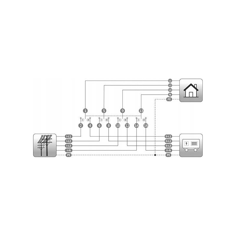 - Przyłącze: zaciski śrubowe 10 mm² (linka); zaciski śrubowe 16 mm² (drut)