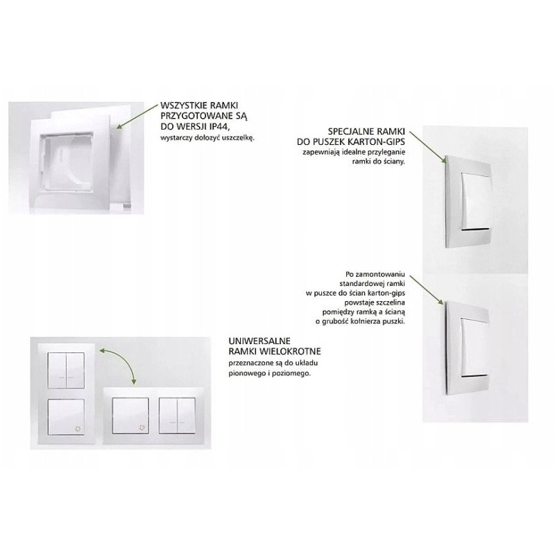 Wyłącznik wyróżnia się ponadczasowym, kremowym wykończeniem, które doskonale pasuje do różnorodnych stylów aranżacyjnych. Jego uniwersalny wygląd sprawia, że świetnie komponuje się zarówno w nowoczesnych, jak i tradycyjnych wnętrzach, dodając im elegancji i stylu.