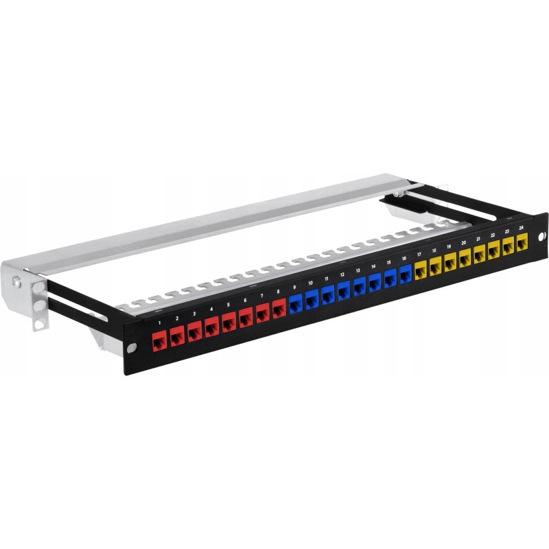 - 24 wolne porty przystosowane do montażu modułów RJ45 typu keystone w różnych konfiguracjach Cat. 5E, Cat. 6, Cat. 6A, Cat. 8 oraz 3M.