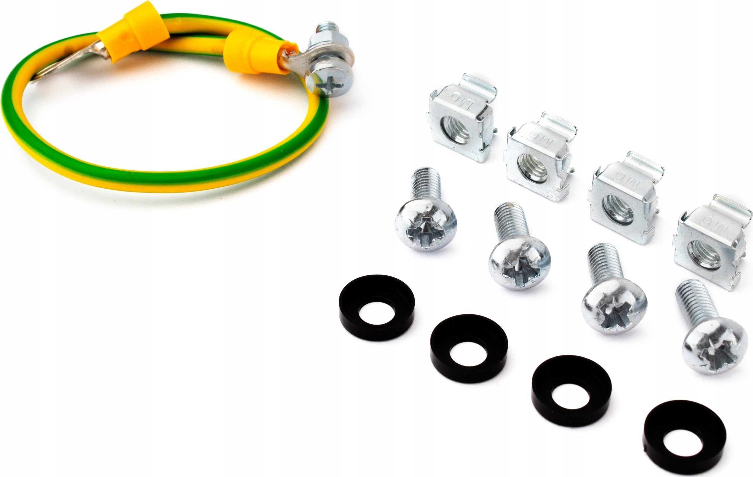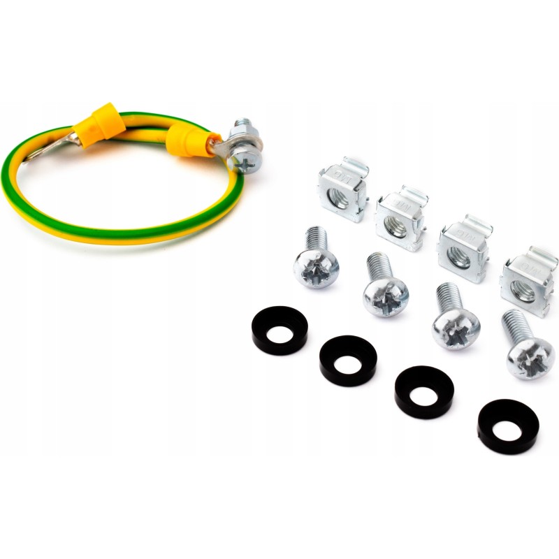 W skład zestawu wchodzą cztery śruby montażowe M6 z koszyczkami i podkładkami oraz kabel uziemiający.