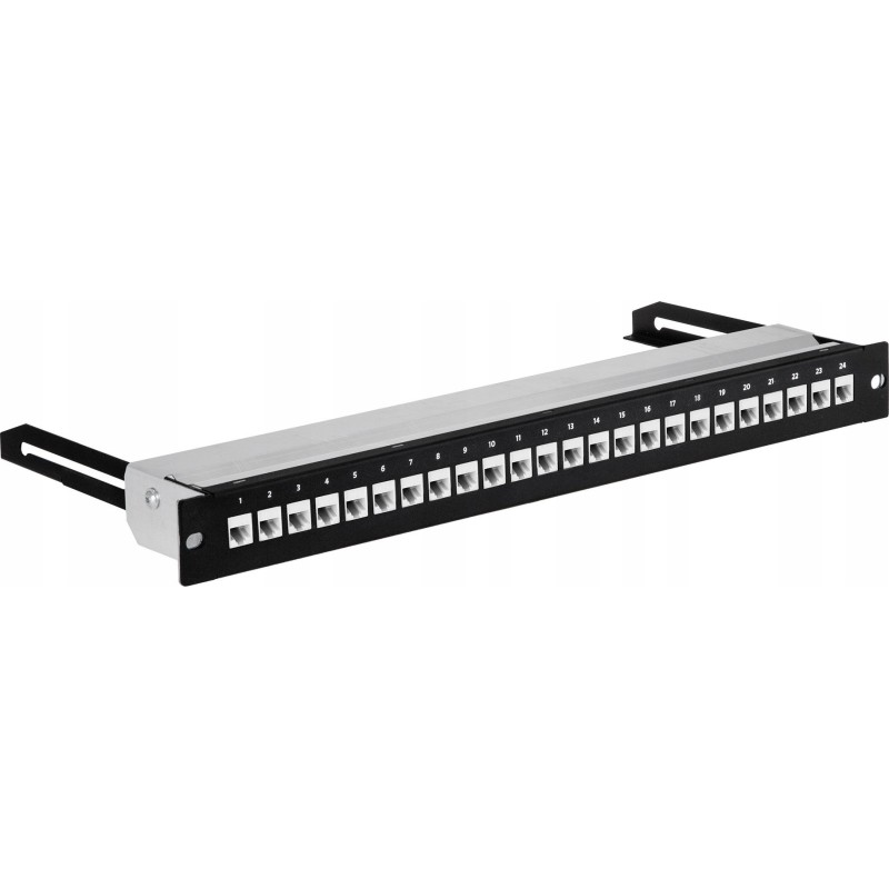 Uniwersalny panel krosowy jest wyposażony w 24 wolne porty. Porty przeznaczone są do montażu modułów RJ45 typu keystone w różnych konfiguracjach. Jest zgodny z gniazdami Cat. 5E, Cat. 6, Cat. 6A.