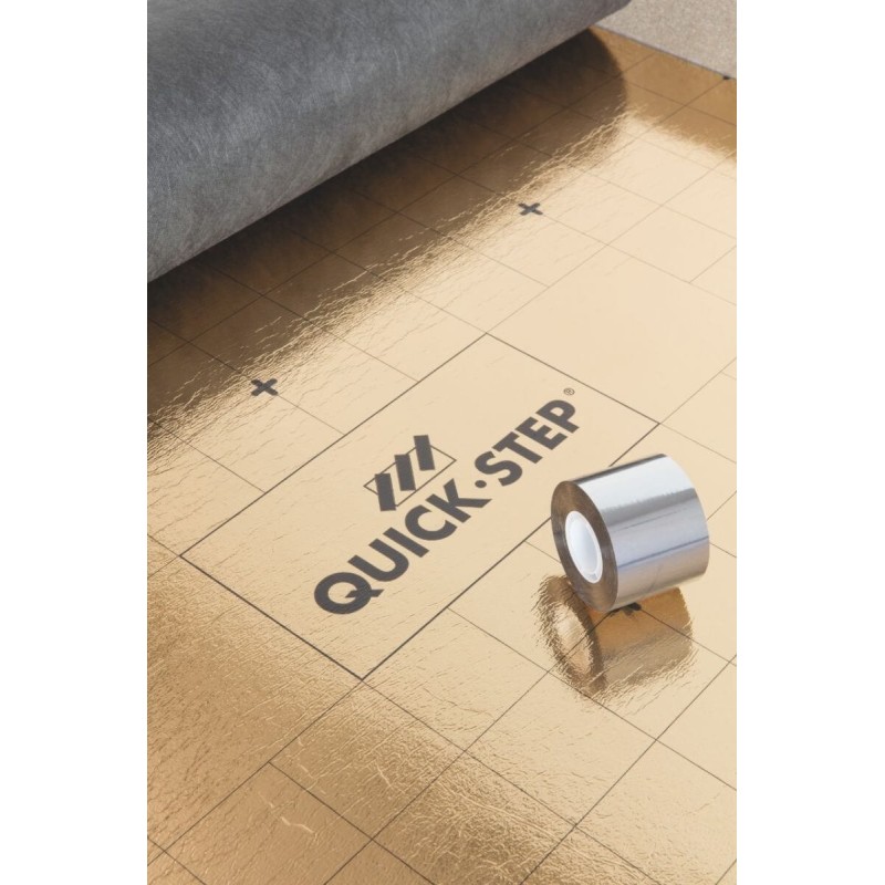 rzędy podkładu układamy obok siebie, równolegle, i łączymy je za pomocą taśmy Aluminium ALU Quick-Step do łączenia podkładów.