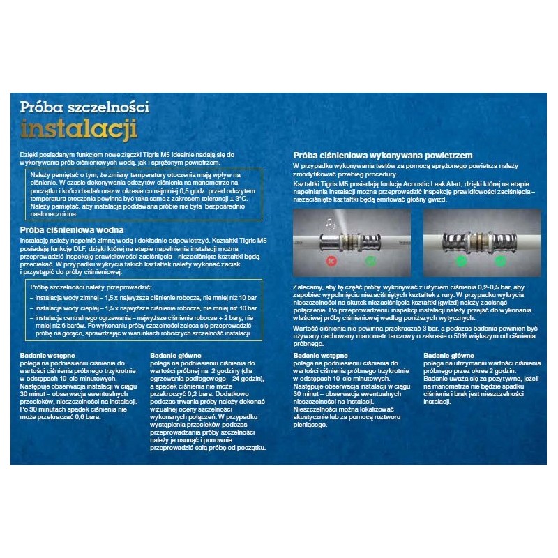 Kształtki Tigris K5 i Tigris M5 z funkcją Acoustic Leak Alert są również wyposażone w funkcję Defined Leak. Oznacza to, że pominiętą kształtkę można łatwo wykryć, niezależnie od użytego medium - powietrza lub wody.