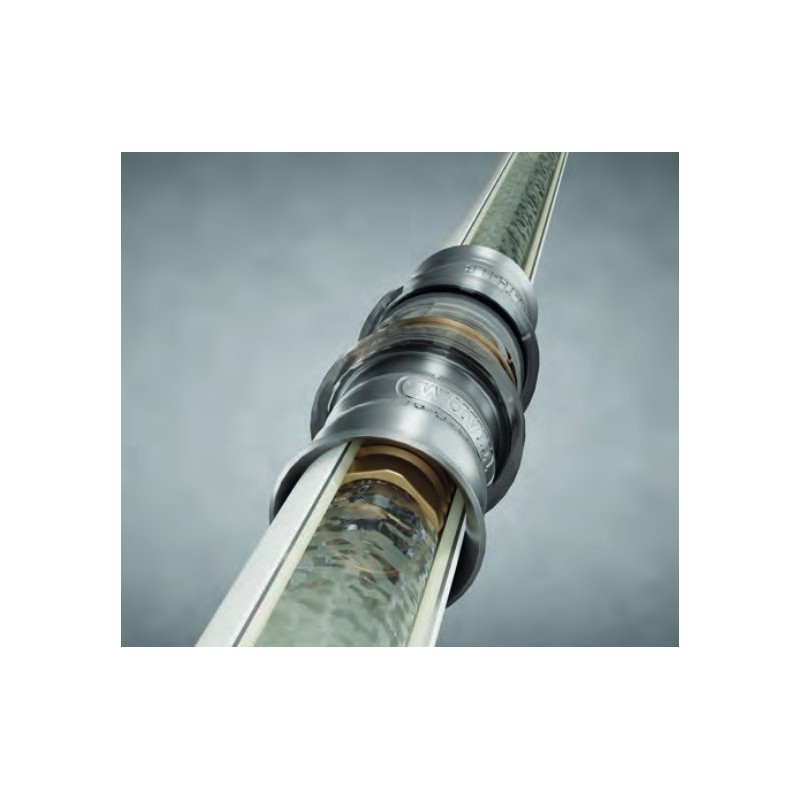 Aby zaprasowane połączenie było niezawodne, istotne jest prawidłowe umieszczenie rury w kształtce. Funkcja IN4SURE pozwala wizualnie sprawdzić, czy rura została odpowiednio umieszczona w kształtce. Przezroczyste pierścienie w kształtkach Tigris K5 i M5 umożliwiają kontrolę wizualną w zakresie 360°. Jest to szczególnie użyteczne w trudno dostępnych miejscach. Jeśli rura jest widoczna, można przystąpić do zaprasowywania.